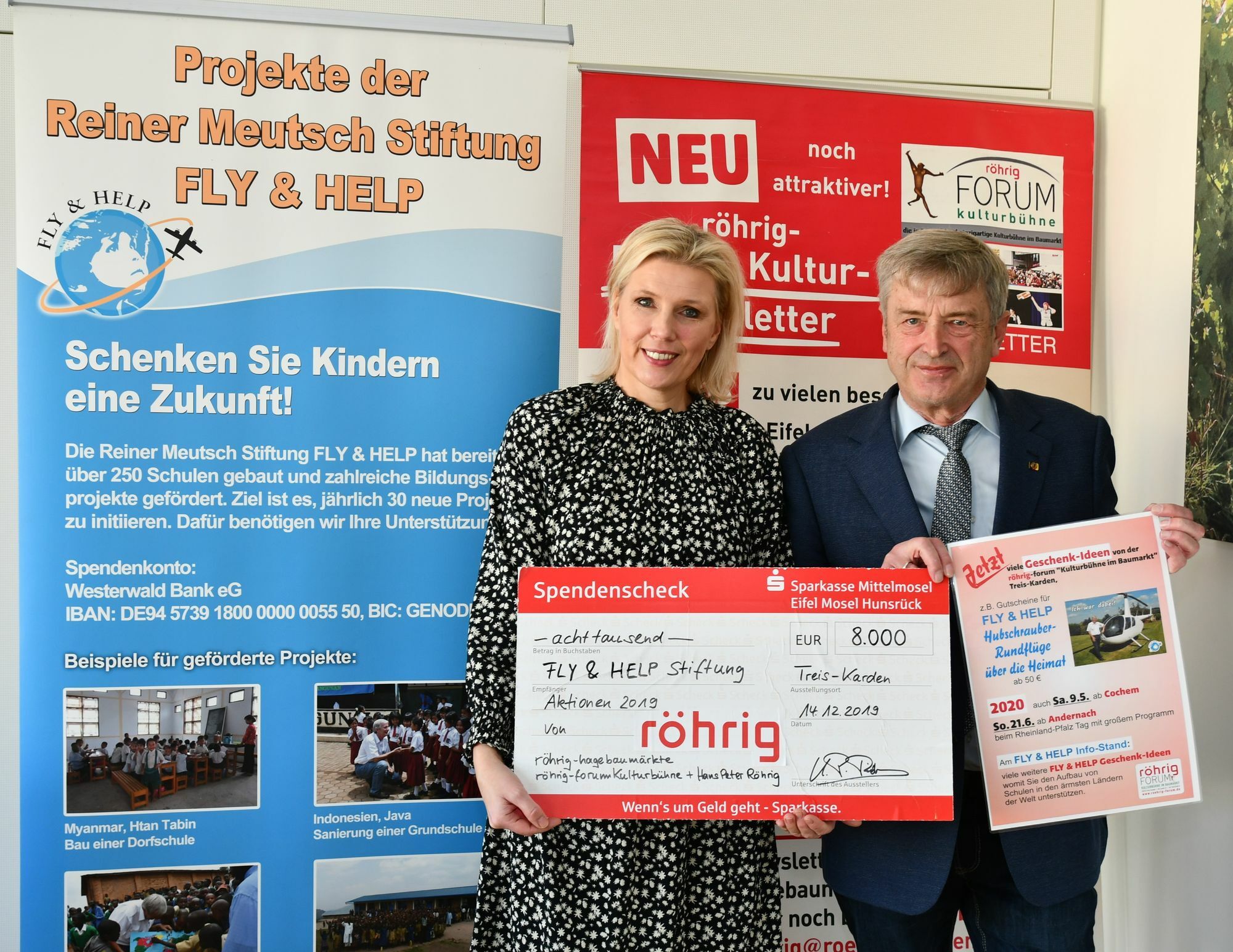 Hans Peter Röhrig überreichte Pia Schmitz-Formes von "Fly & Help" einen Scheck in Höhe von 8.000 Euro für einen Schulbau in Ruanda.