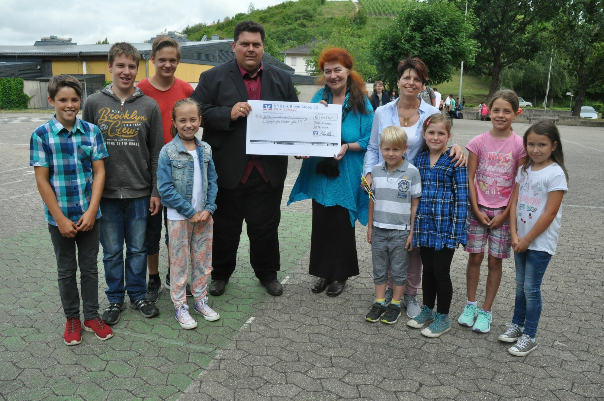 Mehr als 300 Kinder und Jugendliche haben im Stadion eine Stunde lang für die von Edith Wingenfeld gegründete gemeinnützige Gesellschaft für Kinderförderung, "Direkt für Kinder", ihre Runden gedreht. Mit Unterstützung "privater Sponsoren" kamen so 8.485,44 Euro zusammen. Davon fließen 3.395 Euro an den Förderverein der Schule. Mit dem Rest - etwas mehr als 5.000 Euro - werden bedürftige Kinder in Rheinland-Pfalz unterstützt. "Wieder ein tolles Ergebnis", so die gebürtige Treiserin Edith Wingenfeld, die den Spendenscheck von Schulleiter Eugen Hermann und der stellvertretenden Schulleiterin Beate Müller überreicht bekam. Mit dabei waren auch die besten "Rundendreher" und "Spendenbringer": Oliver Henrichs, Paulina Keifenheim, Niklas Tennert, Leon Weingart und Marc Fried. Foto: Pauly www.direkt-fuer-kinder.de