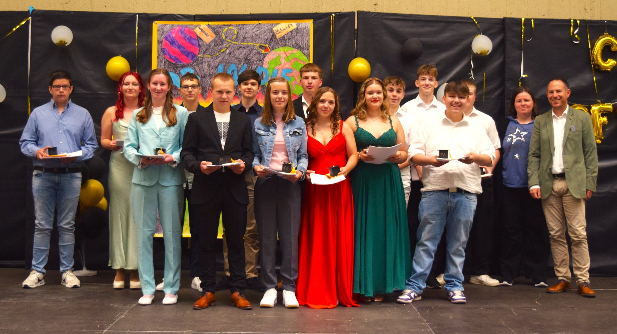 Die Auszeichung für besonderes Engagement innerhalb der Schulgemeinschaft wurde an L. Schug sowie B. Sesterhenn vergeben. J. Castert wurde mit der „Auszeichnung mittlerer Bildungsabschluss Chemie“ durch den Fonds der Chemischen Industrie (FCI), der die besten Schülerinnen und Schüler im Fach Chemie nach Ablegen des mittleren Bildungsabschlusses auszeichnet, geehrt. Zudem wurde J. Castert aus der Klasse 10b mit einem Notenschnitt von 1,3 als Jahrgangsbeste der 10. Klasse von der Leiterin des Fachbereiches Schulen und Kultur Frau Jacobs ausgezeichnet. Selbige Auszeichnung erhielt aus Klasse 9a die Klassenbeste E. Ibald. Ohne Auszeichnung, aber ebenfalls mit einem 1er-Schnitt, dürfen die Schüler B. Sesterhenn (1,6), M. Simons (1,9) und K. Flak (1,9) aus der Klasse 10a nicht ungenannt bleiben.