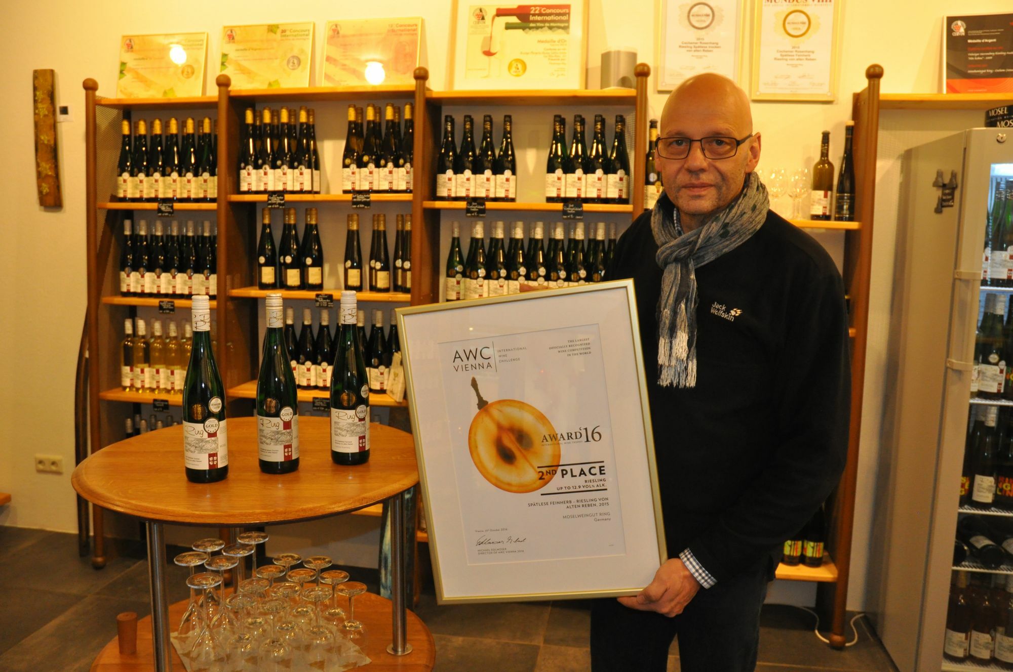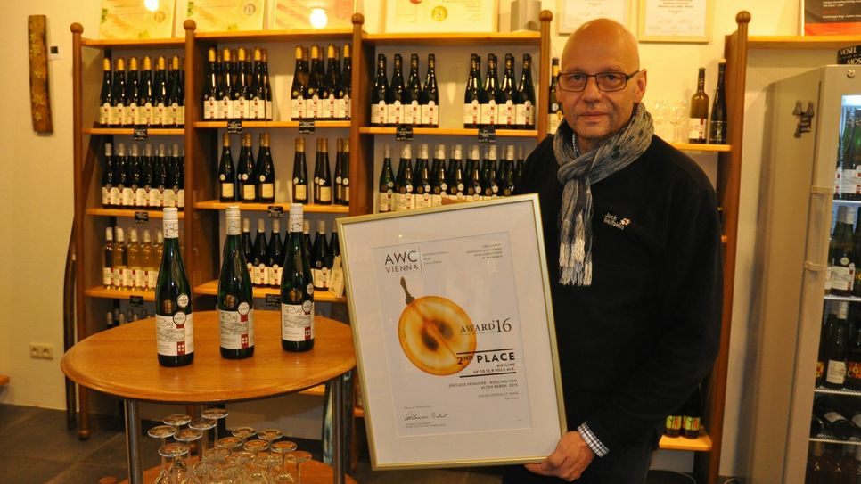 Ein absolut anonymes Kostsystem und die Verkostung in Einzelkosterkabinen bieten jedem Teilnehmer die gleichen Chancen. Für die jeweis drei Erstplatzierten in 35 Weinkategorien ging es nach Wien zur Preisverleihung. "Da wusste ich noch nicht welchen Platz ich belegt hatte, aber ich war einfach überwältigt und überrascht, denn die Messlatte liegt sehr hoch", erzählt der Moselwinzer, der im Rahmen der Siegerehrung - wie alle Preisträger - drei Weine präsentieren durfte. Letztlich wurde eine feinherbe 2015er Riesling-Spätlese von alten Reben auf den zweiten Platz der Kategorie Riesling klassisch - bis 12,9 Prozent Alkoholgehalt gehievt. "Diese Reben sind bis zu 70 Jahren alt. Der Ertrag ist zwar geringer, aber die Intensität ist ganz anders", schwärmt Ring, der eine Rebfläche von 2,5 Hektar in den Weinlagen Conder Nikolausberg, Valwiger Herrenberg und Bruttiger Pfarrgarten bewirtschaftet. Insgesamt konnte der Winzer noch drei Gold- und fünf Silbermedaillen und eine Auszeichnung für das Weingut aus Wien mit nach Hause nehmen. Zusammen mit anderen Auszeichnungen sind die von "AWC-Vienna" wichtige Marketinginstrumente für den internationalen Markt, der bei Ring in einer Vinothek und einem Genusskontor in Cochem sozusagen einen Platz vor Ort hat. Darüber hinaus präsentiert er seine Weine auch auf Messen in Frankreich und Südtirol. Weitere Informationen: www.awc-vienna.at Foto: Pauly