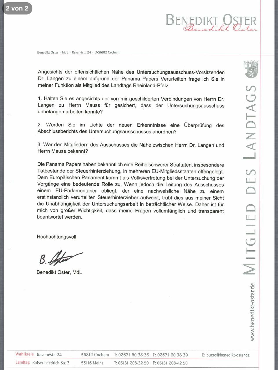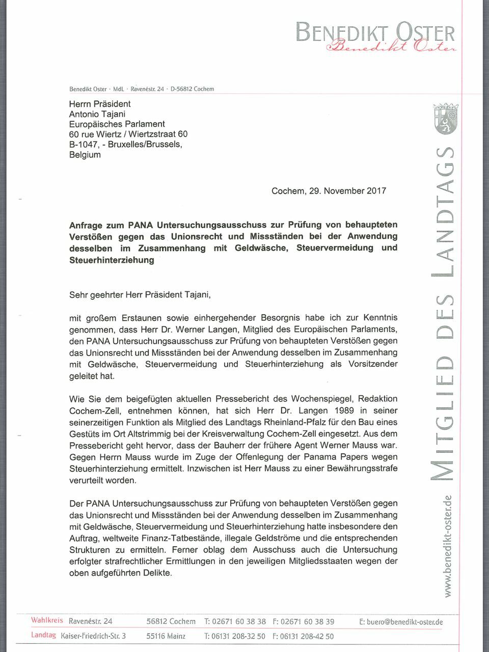 Dr. Langen hat sich Ende der 1980er Jahre bei der Kreisverwaltung Cochem-Zell nach einer Bauvoranfrage für einen Reiterhof erkundigt, die offensichtlich vom Ex-Geheimagenten Werner Mauss gestellt wurde (der WochenSpiegel berichtete). Mauss' Name wird auch im Zusammenhang mit den sogenannten "Panama Papers" gebracht. Benedikt Oster (SPD/MdL) beruft sich in seinem Schreiben auf den Bericht des Cochemer WochenSpiegel. Das Schriftstück ist angehängt. Als "Panama Papers" werden vertrauliche Unterlagen des panamaischen Offshore-Dienstleisters Mossack Fonseca bezeichnet, die 2016 an die Öffentlichkeit gelangten. Sie stehen offenbar für legale Strategien der Steuervermeidung, aber auch Steuer- und Geldwäschedelikte. Die Enthüllungen haben in zahlreichen Ländern zu Ermittlungen geführt und Debatten über Steuerschlupflöcher, Briefkastenfirmen, Steueroasen, Steuerdelikte und Steuermoral ausgelöst. Fotos: Archiv/privat