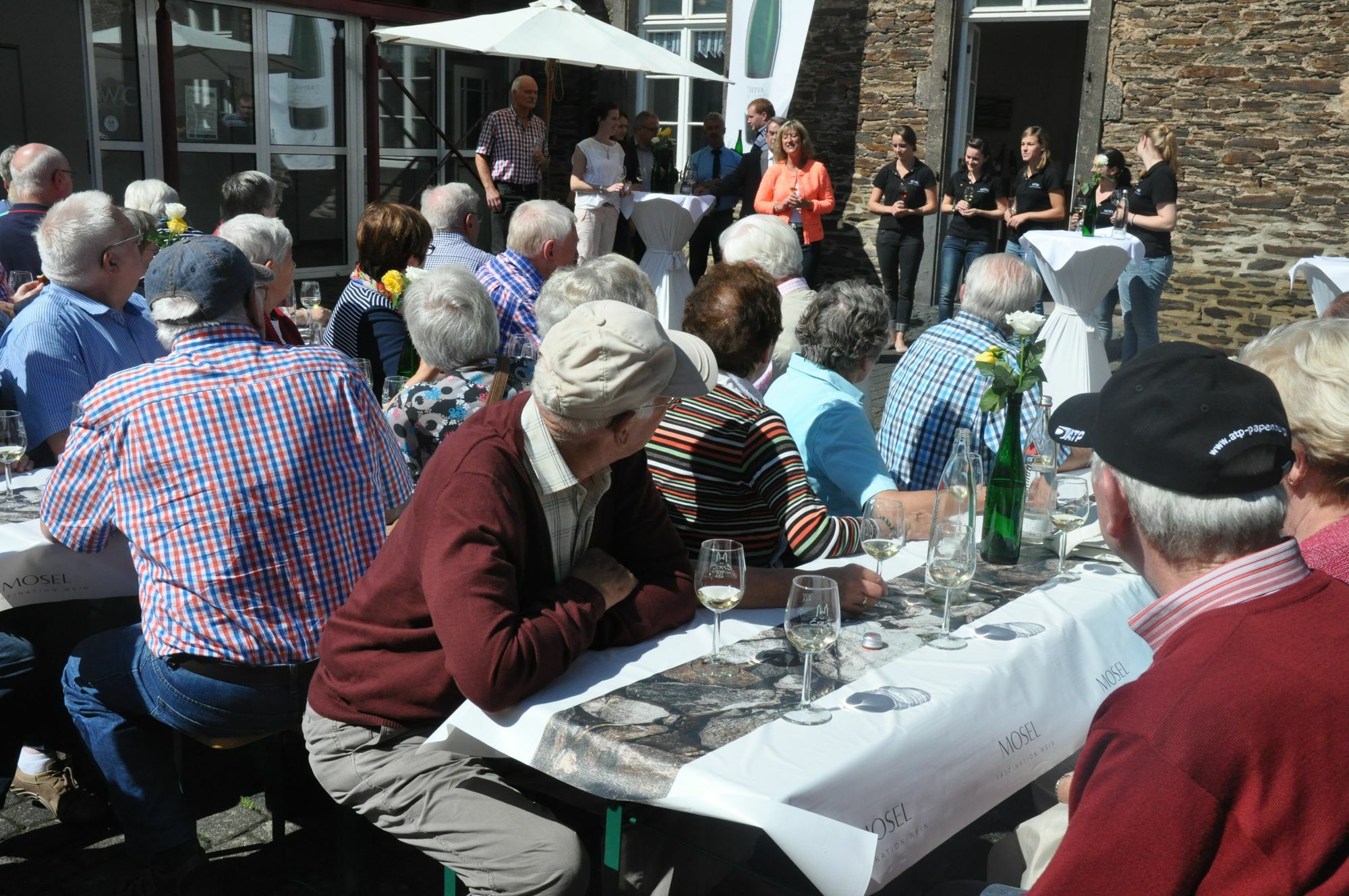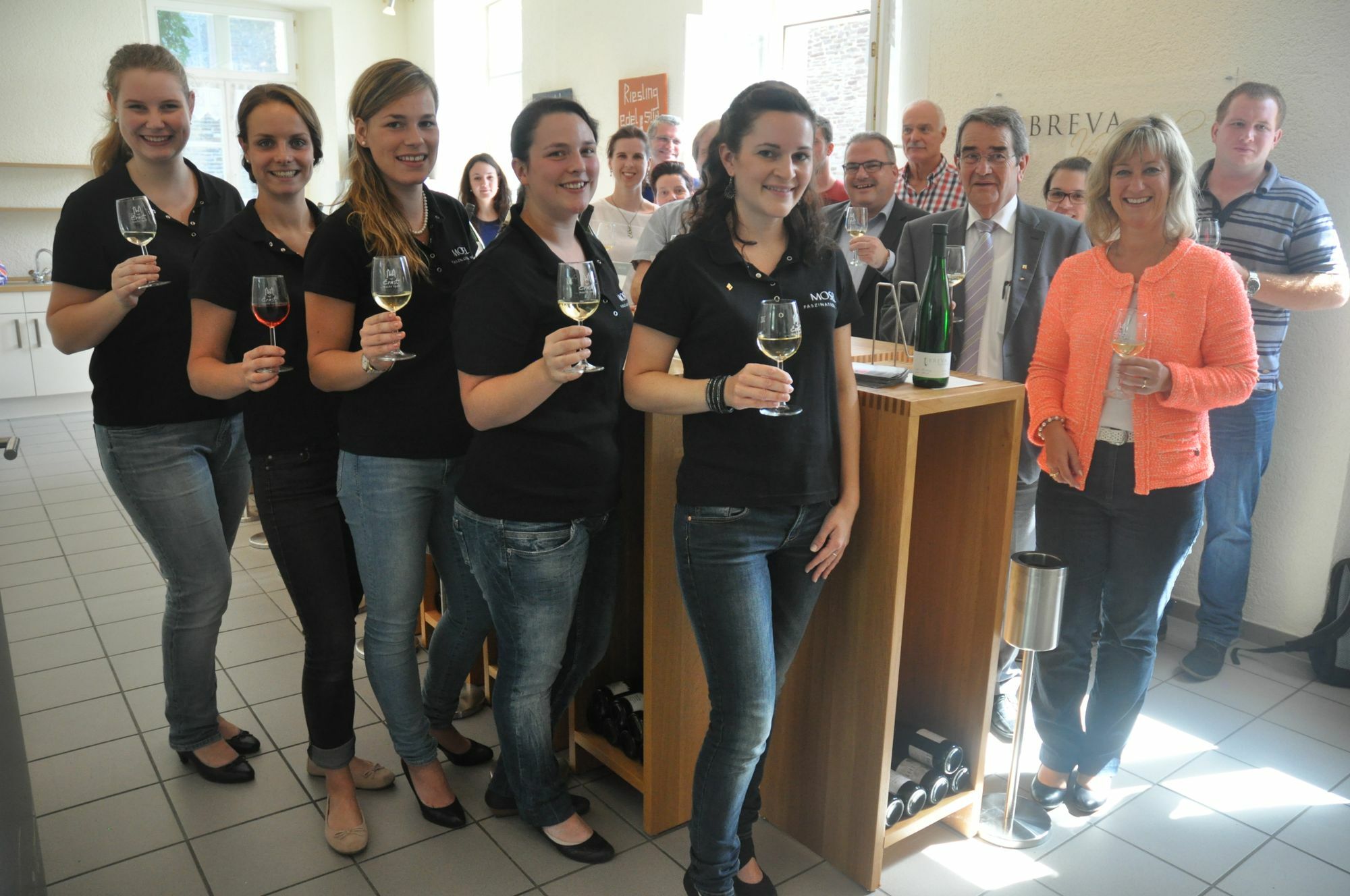 Die fünf Anwärterinnen besuchten im Vorfeld der Wahl das BREVA-Projekt. Unter anderem wurden sie mit der Monorackbahn in den BREVA-Weg "entführt". Dort ging es durch die Steillage "Valwiger Herrenberg". Darüber hinaus mussten sie in der Vinothek in Ernst schon einmal ihren Wein-Sachverstand zum Besten geben. "Der Weg zur Moselkrone führt durch den Landkreis Cochem-Zell", begrüßte Anke Beilstein, BREVA-Präsidentin, die "engagierten Frauen, die von Wein viel Ahnung haben." In Ernst mussten die jungen Damen das bei der Vorstellung eines Weines beweisen. Verena Dauns (3. v. l.) wählte einen Riesling Kabinett trocken aus, den sie souverän präsentierte. Die Expertin, die unter anderem auch in Südafrika Weinbauerfahrungen sammelte, sieht ihre Kandidatur als "Sahnehäubchen" ihrer Ausbildung. "Wir verstehen uns gut und es gibt auch keine Konkurrenz. Wenn es klappt, ist es schön, wenn nicht übernehme ich mit meiner Schwester das elterliche Weingut", lacht die Reilerin. Foto: Pauly www.brevaweinundweg.de
