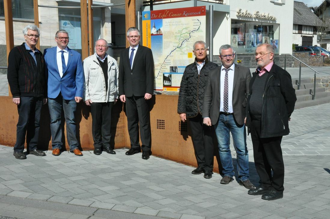 Die Mayener Bruderschaft hat es sich zur Aufgabe gemacht die Wege der Jakobspilger auf dem Eifel-Camino zu kennzeichnen. Heinz Schäfer, Brudermeister der Mayener St. Matthias-Bruderschaft, konnte jetzt in Kaisersesch die elfte Hinweistafel über den Eifeler Ableger des Jakobswegs übergeben. "Es ist ein weiterer Meilenstein", so Schäfer, der von Pilgern aus ganz Deutschland berichten konnte, die den Eifel-Camino bereits unter ihre Füße genommen haben. In Kaisersesch steht ihnen jetzt sogar ein "Pilgerzimmer" über dem "Prison" zur Verfügung. Eine Information, die - wie viele andere über die Eifelstadt und den Pilgerweg - ebenfalls auf der Tafel nachzulesen ist. Unterstützt wurde die Anschaffung und Aufstellung der Tafel von der Raiffeisenbank Eifeltor. Ein Motor im Engagement für den Eifel-Camino und die Pilger ist der Kaisersescher Jürgen Weis, der sich seit Jahren für die gemeinsame Sache mit den Mayener St. Matthiasbrüdern einsetzt und von Stadtbürgermeister Gerhard Weber ein Sonderlob erhielt. Im kommenden Jahr wird die Bruderschaft mit dem Aufstellen eines Pilgersteins an der Waldkapelle die Rolle Kaiserseschs für den Eifel-Camino noch einmal besonders herausheben, versprach Heinz Schäfer. Foto: Pauly www.eifelcamino.de