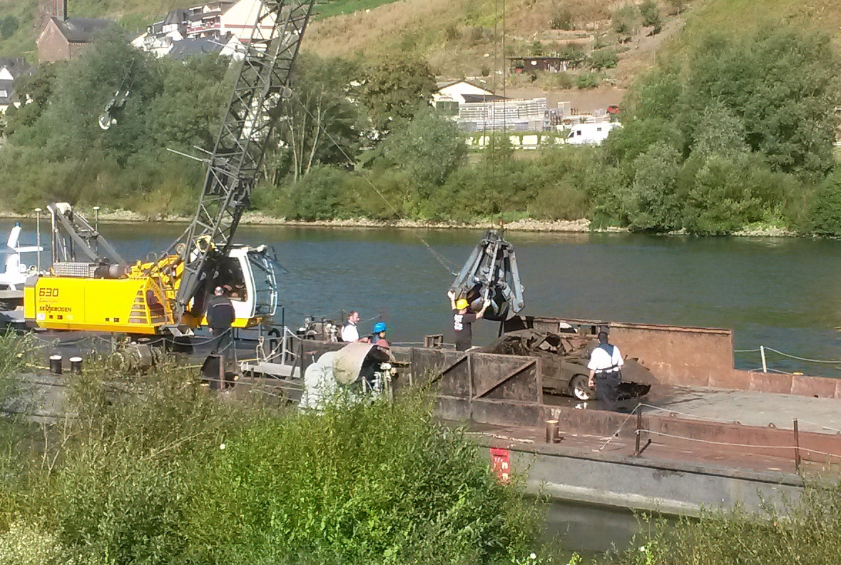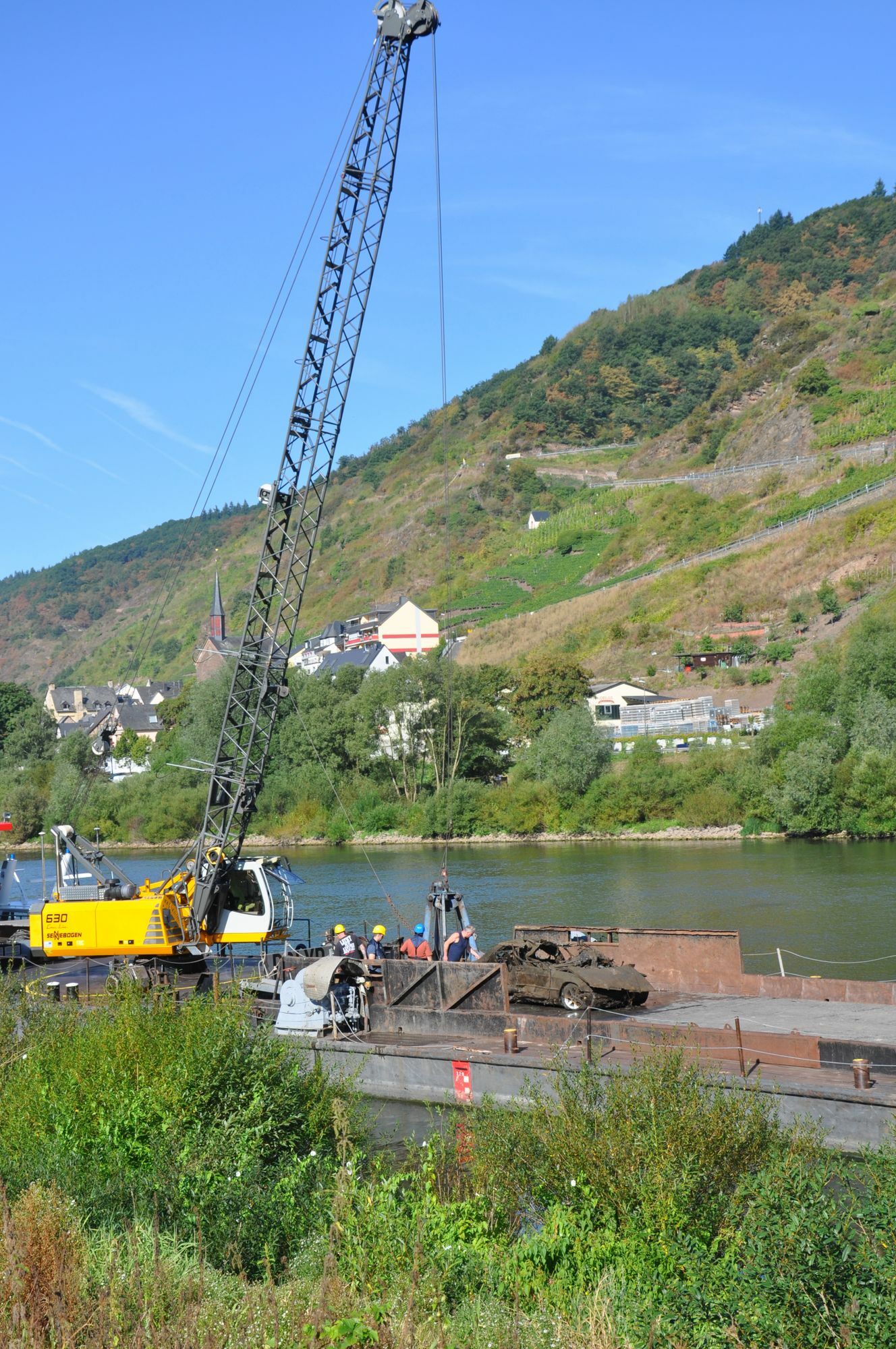 Das Auto lag vermutlich mehrere Jahre auf dem Grund der Mosel. Heute wurde es auf das Deck eines Schiffes gehievt. Bericht folgt. Foto: Hommes