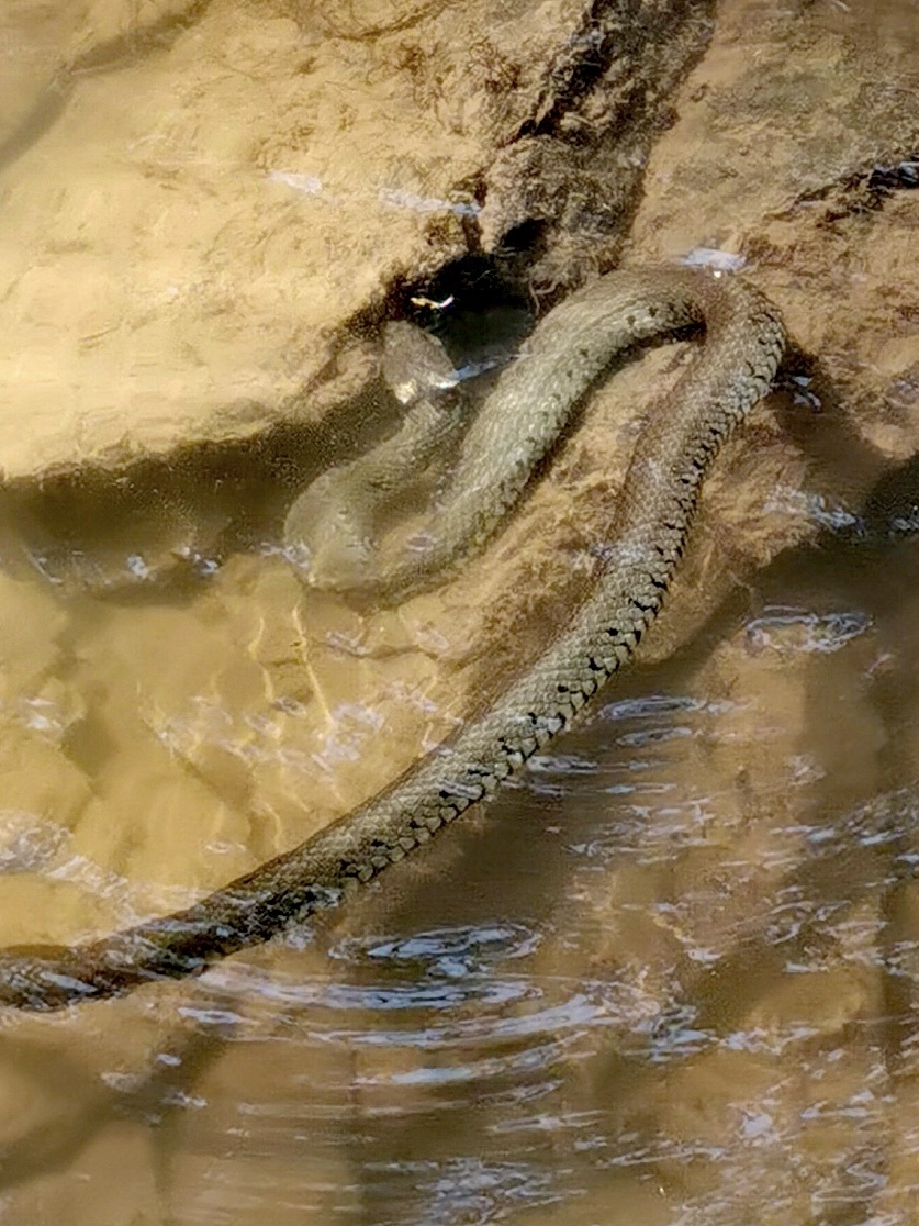 Bei einem Spaziergang an der Elz unterhalb der Burg Pyrmont konnte ich eine schwimmende Ringelnatter in der Elz aufnehmen. Sie befand sich wahrscheinlich auf der Jagd und schwamm einige Meter vor mir hin und her.