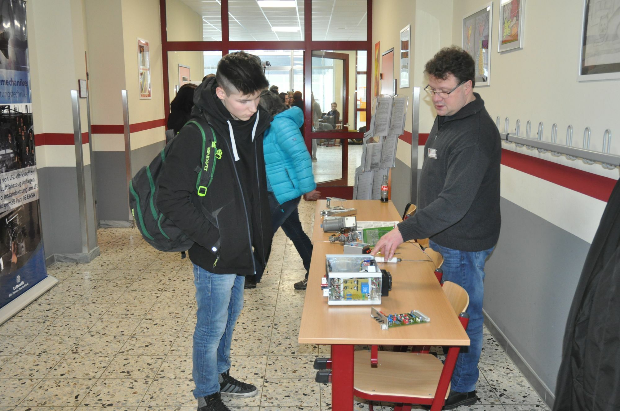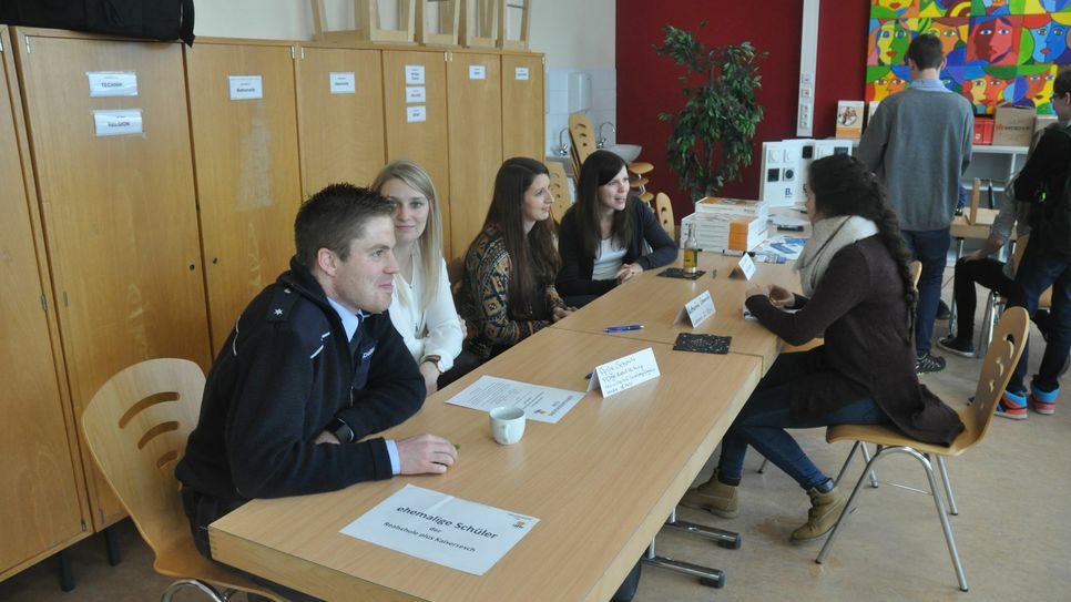 Nach drei Stunden zieht Anja Schmitz, Pflegedienstleiterin in einer Senioreneinrichtung, ein erstes Fazit. "Die Schülerinnen und Schüler sind interessiert, aber zurückhaltend", so die ehemalige Kaisersescher Realschülerin, die zusammen mit anderen Ehemaligen Rede und Antwort steht. "Viele wissen aber noch nicht, was sie machen sollen", fasst Anja schmitz ihre Eindrücke zusammen. Und Philipp Schaden hatte zum Beginn das Gefühl, dass seine Polizeiuniform die Jugendlichen etwas verunsicherte. Das Interesse am Beruf des Polizisten nahm so erst einmal langsam Fahrt auf. Die Ehemaligen aus der Abteilung Handwerk waren indes enttäuscht. Matthias Wagner von Thias-Elektronik und Matthias Süß von der Schreinerei Rieger hatten sich mehr Resonanz erhofft. "Wir haben zwar gute Jahrespraktikanten, aber die gehen weiter zur Schule. Wir wollten hier zeigen, dass man auch mit dem früheren Haupt- oder dem Realschulabschluss der Weg in die Selbstständigkeit geschafft werden kann", sagt Wagner. Ein Mehr an Bewerbern erhofft sich auch Werner Knechtges, Ausbildungsleiter bei der Bundeswehr am Fliegerhorst in Büchel. Hier werden in jedem Jahr 24 Flugzeuggerätemechaniker und zwölf Elektroniker ausgebildet. "Wir haben Bewerbungen aus ganz Deutschland, aber andere Firmen suchen auch und leider sind nicht alle Bewerber qualifiziert", erzählt der Ausbildungsexperte, der die Vorzüge in Büchel noch einmal herausstellt. "Wir sind zwar bei der Bundeswehr, bilden aber für einen zivilen Beruf aus. Wir kümmern uns vom ersten bis zum letzten Tag der Ausbildung um unsere Schützlinge, die letztlich eine Lehrwerkstatt durchlaufen." Insgesamt konnten sich die Acht- bis Zehntklässler an 19 Infoständen von Handwerkern und Dienstleistern informieren. Darüber hinaus gab es die Möglichkeit an individuellen Bewerbertrainings und Workshops zu Berufen teilzunehmen. "Uns war es wichtig, persönliche Begegnungen zu ermöglichen. Und ich denke, dass wir eine gesunde Mischung angeboten haben", zog Schulleiter Hans-Jürgen Schmitz eine zufriedene Bilanz der Ausbildungsmesse. Fotos: Pauly www.rsplusfos-kaisersesch.de