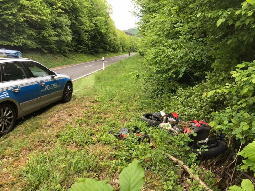 Der 65-jährige Motorradfahrer aus Nordrhein Westfalen kam dabei zu Fall und landete im Straßengraben. Er wurde bei dem Unfall schwer verletzt und vom DRK in ein Krankenhaus eingeliefert. Das Rehwild verendete an der Unfallstelle. Foto: Zender