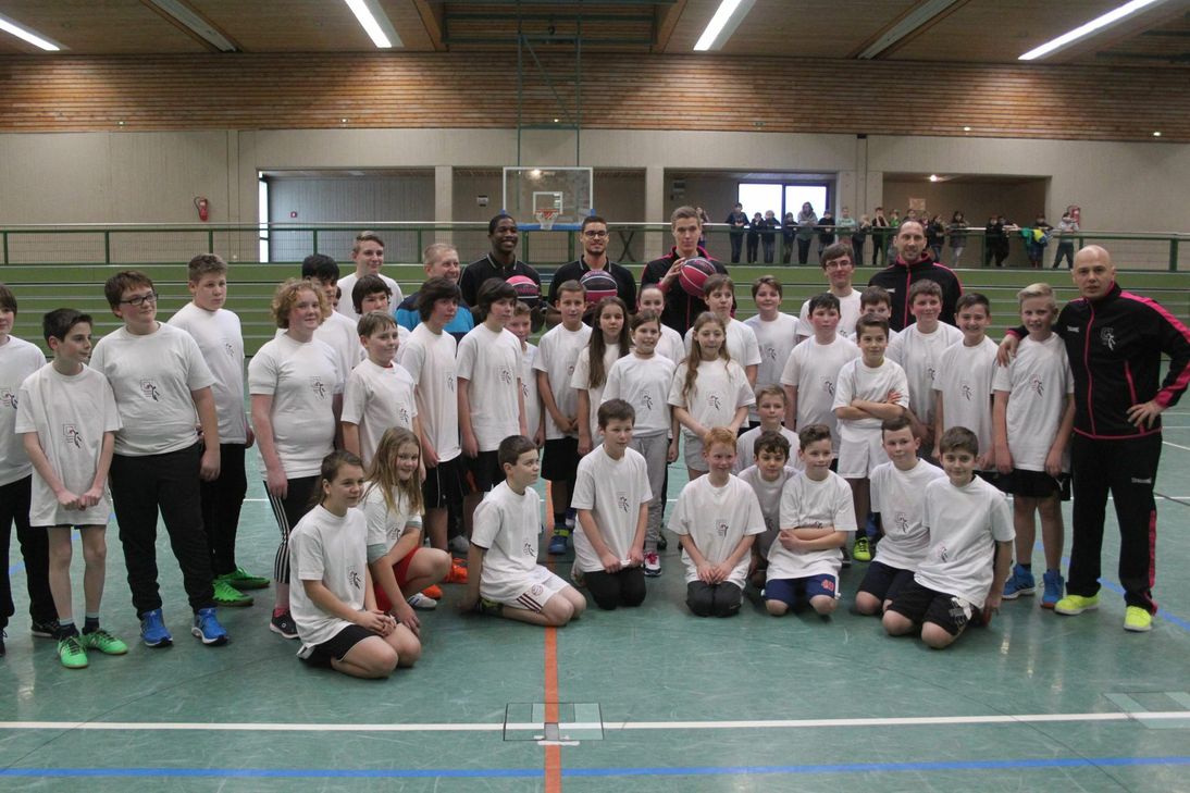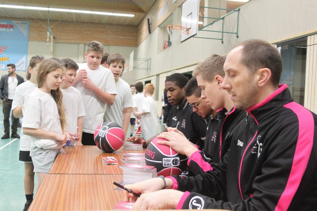 Ermöglicht wurde der Auftritt durch Felix Dauns. Der Schüler hatte sich für ein Training mit Trainern und Profis der Bonner BBL-Mannschaft beworben. Nach einem schweißtreibenden Aufwärmprogramm übernahm Co-Trainer Chris O’Shea den Trainingsbetrieb. Auf dem Trainingsplan standen Dribblings, Würfe auf den Korb, Korbleger und Finten, die von Krafteinheiten unterbrochen wurden. Während der letzten 20 Minuten wurde gespielt, bei denen auch die Profis dabei waren. Ein weiterer Höhepunkt war die gemeinsame Abschlussrunde, bei der die Schülerinnen und Schülern den Bundesligaspielern Fragen stellen durften. Auf die Frage an Gerald Beverly, ob er denn auch "dunken" könne, ließ sich dieser nicht lange bitten, nahm einen Ball und sprang nach kurzem Anlauf hoch, um den Ball als "Dunking" in den Korb zu befördern. Abschließend hatten alle die Möglichkeit, sich Autogramme schreiben zu lassen. Die Basketballer schrieben geduldig auf Autogrammkarten, T-Shirts, Schuhe oder Handyhüllen. Als Gastgeschenk für die Schule überreichten die Profis noch drei handsignierte Basketbälle. Fotos: privat www.schulen-treis-karden.de