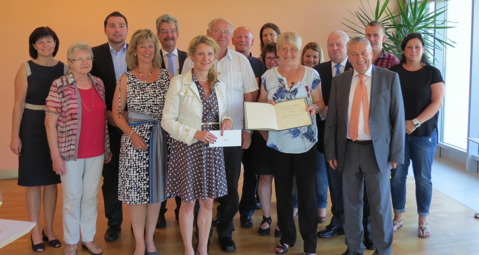 Raab wies in ihrer Laudatio darauf hin, dass die Bandbreite des ehrenamtlichen Wirkens von Inge Krämer beeindruckend sei. Bereits 1983 setzte sich Krämer für die Gründung einer Jugendgruppe in ihrem Heimatort Auderath ein, die sie dann zwanzig Jahre leitete. Ob es in den 90iger Jahren die Aufgabe war, die ersten Aussiedler in ihrer neuen Heimat zu integrieren oder dann einige Jahre später in der Verbandsgemeinde Ulmen eine Senioreninitiative auf den Weg zu bringen und zu betreuen – Inge Krämer stellte sich diesen Aufgaben mit dem selben Engagement, wie sie dies auch jahrzehntelang in der Kommunalpolitik tat. So gehörte sie von 1989 bis 2014 ununterbrochen dem Kreistag des Landkreises Cochem-Zell an. Das Amt der Kreisbeigeordneten - damit eine der Stellvertreter des Landrates - hatte Inge Krämer von 1999 bis 2014 inne. Seit 2014 ist sie Mitglied im Gemeinderat von Auderath. "Sie sind für viele ehrenamtlich tätige Menschen ein großes Vorbild und Ihr Wirken ist immer an der Sache und dem Menschen orientiert", würdigte Staatssekretärin Heike Raab die Leistungen von Inge Krämer. Auch Landrat Manfred Schnur hob den ehrenamtlichen Einsatz der ehemaligen Kreisbeigeordneten hervor. "Diese hohe Auszeichnung wird nur an Menschen verliehen, die in besondere Weise mitgestalten und Verantwortung für andere übernehmen", so der Kreischef. Er dankte Inge Krämer im Namen der Kreisgremien für ihren vorbildlichen Einsatz. Bürgermeister Alfred Steimers betonte in seinen Dankesworten, dass er stolz sei, eine solch engagierte Mitbürgerin in der Verbandsgemeinde Ulmen zu wissen. Ebenfalls zur Auszeichnung gratulierten die beiden Landtagsabgeordneten Anke Beilstein und Benedikt Oster, Landrat a. D Eckhard Huwer, Ortsbürgermeister Paul Laux sowie Karl-Peter Toss aus Gevenich, der eine Ordensverleihung angeregt hatte. Foto: privat