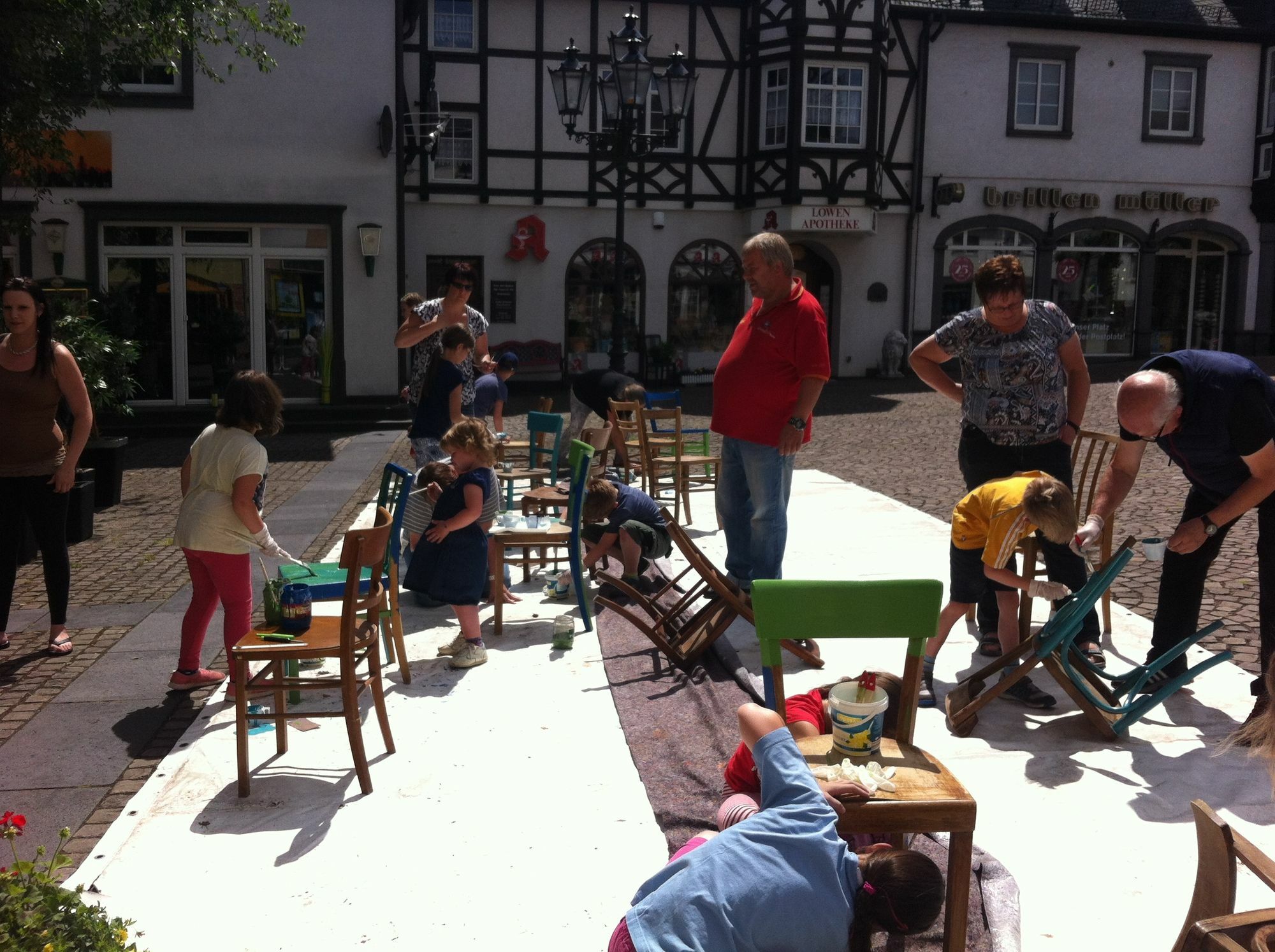 Kinder und Erwachsene waren mit Feuereifer und jeder Menge Spaß am Werk. Zum Schluss war ein gutes Dutzend alter Stühle mit neuem Glanz versehen. Jeder Stuhl wurde zu einem unverwechselbaren Unikat Die Organisatoren des Malfestes, eine kleine Gruppe von Ulmener Geschäftsleuten, die das Stadtzentrum rund um den "Alten Postplatz" neu beleben möchten, freuten sich über die Teilnahme und das Ergebnis. Pflanzschalen mit roten und gelben Blumen, entsprechend den Farben des Ulmener Wappens, schmücken jetzt die Stühle, die im Stadtkern bewundert werden können. "Unser Dank geht an alle Künstler. Nachahmer sind gerne gesehen. Ulmen kann erblühen, wenn alle mithelfen. Weitere Aktionen auf dem Alten Postplatz sind in Planung", so die Organisatoren. Foto: privat