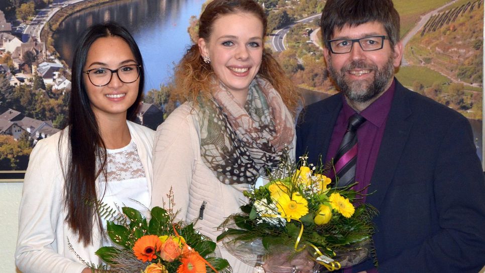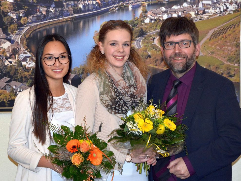 Cochems Stadtürgermeister Wolfgang Lambertz empfing nun die neuen Weinmajestäten im Rathaus am Marktplatz. Lisa Laux wird beim diesjährigen Cochemer Weinfest zur neuen Weinkönigin gekrönt und gemeinsam mit Weinprinzessin Bichi Pham die Moselstadt und den edlen Tropfen nach außen repräsentieren. Besonders freuen sich die neuen Weinmajestäten auf die vielen neuen Erfahrungen und Kontakte, die die zahlreichen Weinfeste in der Umgebung für sie bereithalten. Und Wolfgang Lambertz kündigt schon jetzt einen Höhepunkt für die neuen Majestäten an. "Im Jahr 2018 werden Lisa und Bichi mit der Cochemer Bürgerwehr nach New York fliegen und an der Steuben-Parade, einem der größten Ereignisse im deutsch-amerikanischen Festkalender, teilnehmen", berichtet der Stadtchef nicht ohne Stolz. Foto: Werff