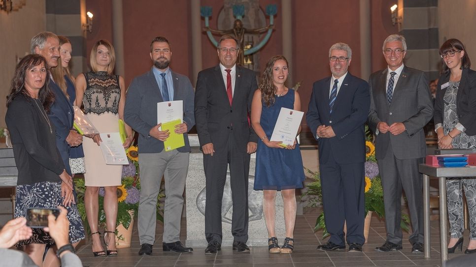 Staatsminister Roger Lewentz überreichte in der Feierstunde den Absolventinnen und Absolventen ihre Urkunden zum Bachelor of Arts in den Studiengängen Verwaltung und Verwaltungsbetriebswirtschaft beziehungsweise zur Verwaltungswirtin oder zum Verwaltungswirt. Lisa Marx von der Kreisverwaltung Bernkastel-Wittlich, Sascha Müller, Kreisverwaltung Cochem-Zell, Simone Müller von der Stadtverwaltung Neustadt/Weinstraße und Katharina Schmitz von der Aufsichts- und Dienstleistungsdirektion Trier wurden als Prüfungsbeste der Zentralen Verwaltungsschule ausgezeichnet. Als beste Absolventinnen der Hochschule für öffentliche Verwaltung wurden Anna Steeg und Sarah Schultz (beide Kreisverwaltung Mainz-Bingen) geehrt. Dominik Beck (Kreisverwaltung Westerwaldkreis), Christopher Horbach (Verbandsgemeindeverwaltung Herrstein), Ann-Kristin Schmitt (Struktur- und Genehmigungsdirektion Nord) und Martin Thielen (Verbandsgemeindeverwaltung Prüm) wurden jeweils für hervorragende Bachelor-Arbeiten ausgezeichnet. Foto: HöV / Seydel Mayen www.hoev-rlp.de