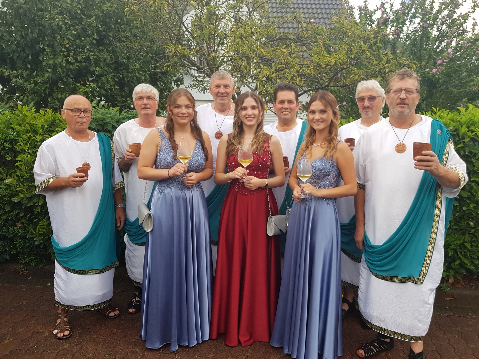 Die neuen Cochemer Weinmajestätinnen Victoria, Alicia und Johanna hatten vor ihrer Krönung am Eröffnungsabend des diesjährigen Heimat- und Weinfestes neben weiteren Cochemer Gruppen auch die illustren Cochemer Weinrömerinnen und Weinrömer zum Umtrunk eingeladen. Die Weinrömer nutzten die Gelegenheit zu einem gemeinsamen Erinnerungsfoto und wünschten eine gute Regentschaft.