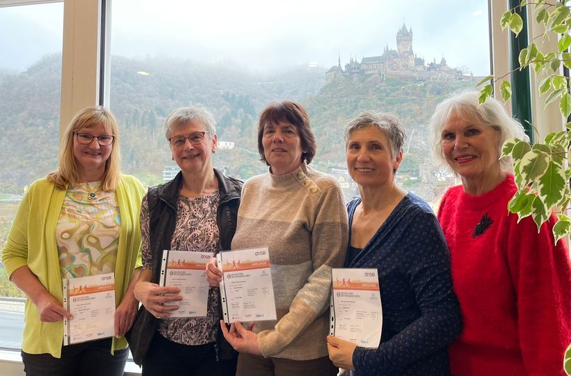 Barbara Allard-Reuter, Margit Klinkner,  Karin Breitbach, Margit Rutz und Sportabzeichenprüferin Elfi Keske präsentieren stolz ihre DSA-Urkunden