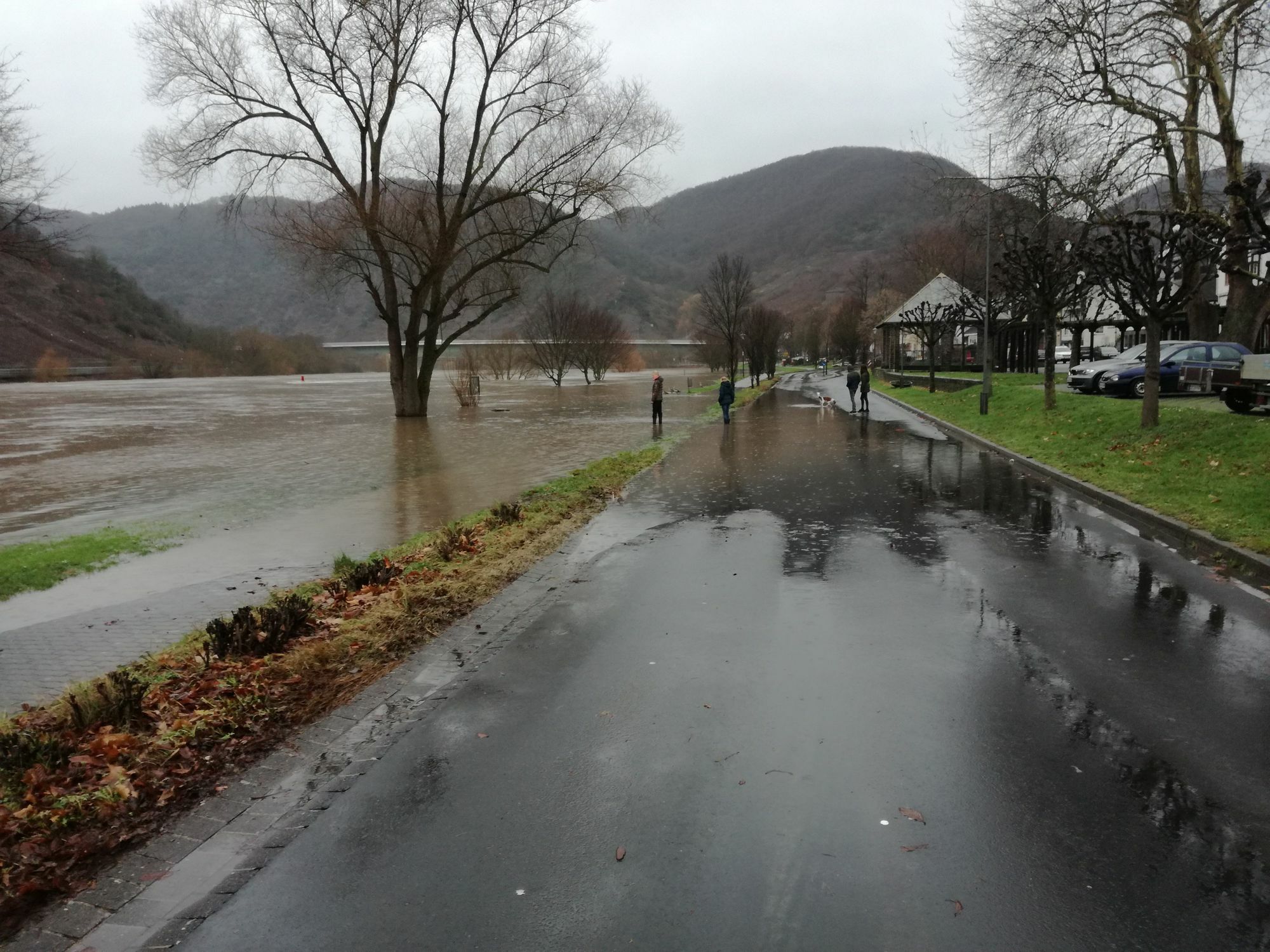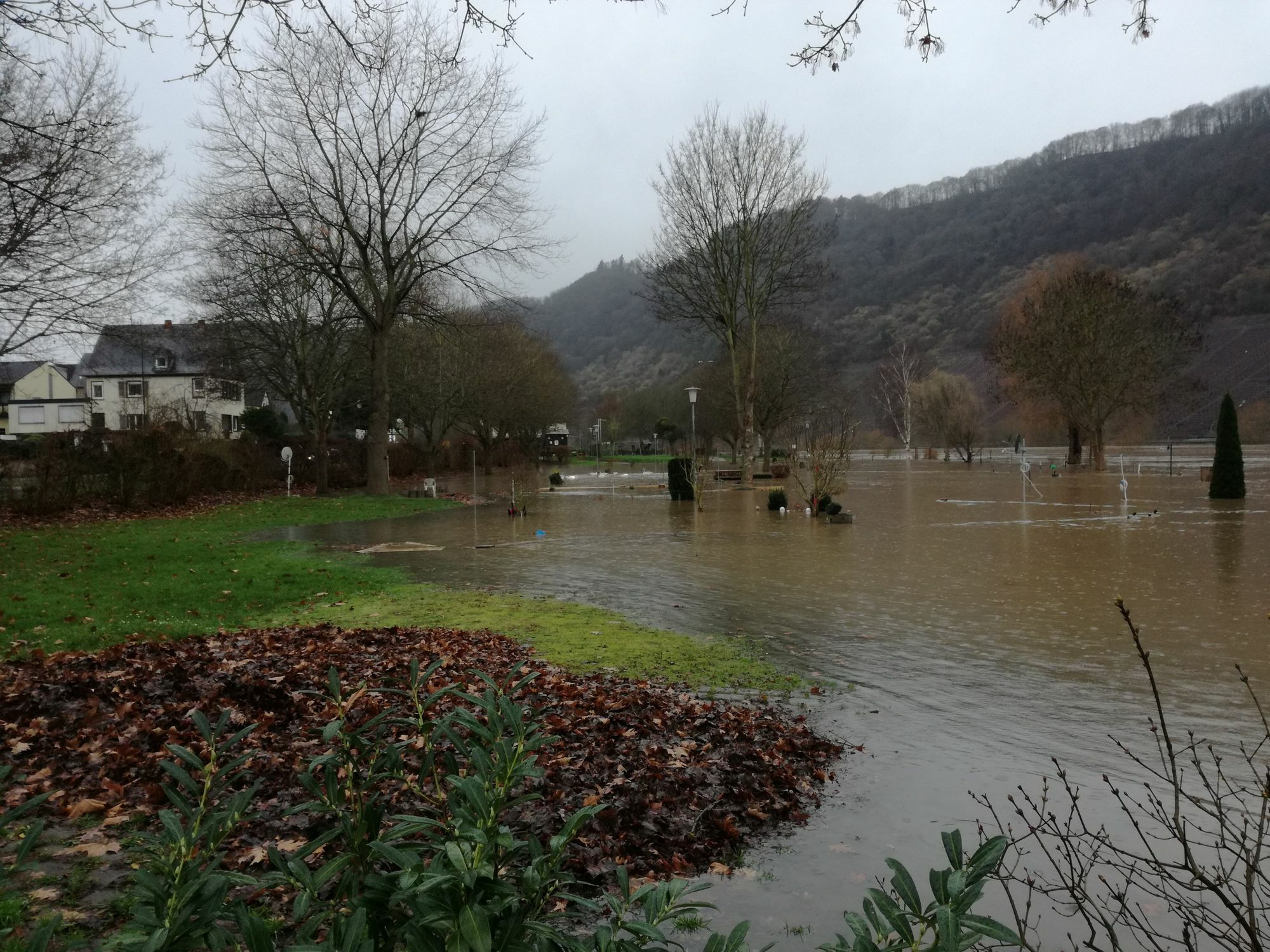 Um 10 Uhr wurde für Cochem ein Pegel von 6,54 Meter gemeldet. Die für heute vom Wetterdienst nochmals vorhergesagten recht ergiebigen Niederschläge werden allerdings erneute Wiederanstiege aller Pegel im Laufe des heutigen Nachmittages, der kommenden Nacht und über den morgigen Freitag hinaus bis zum Wochenende bewirken. Es ist dabei mit Wasserständen zu rechnen, die über den bisher erreichten Höchstwerten liegen werden. In der 24-Stunden-Prognose wird mit einem Wert von 6,65 bis 6,85 Metern gerechnet. Zurzeit ist die B 416 zwischen Müden und Moselkern wegen Hochwassers gesperrt. In Bruttig schwappt die Mosel ebenfalls bereits auf die Uferstraße. Der Campingplatz der Gemeinde befindet sich schon unter Wasser. Fotos: Brilatus www.hochwasser-rlp.de