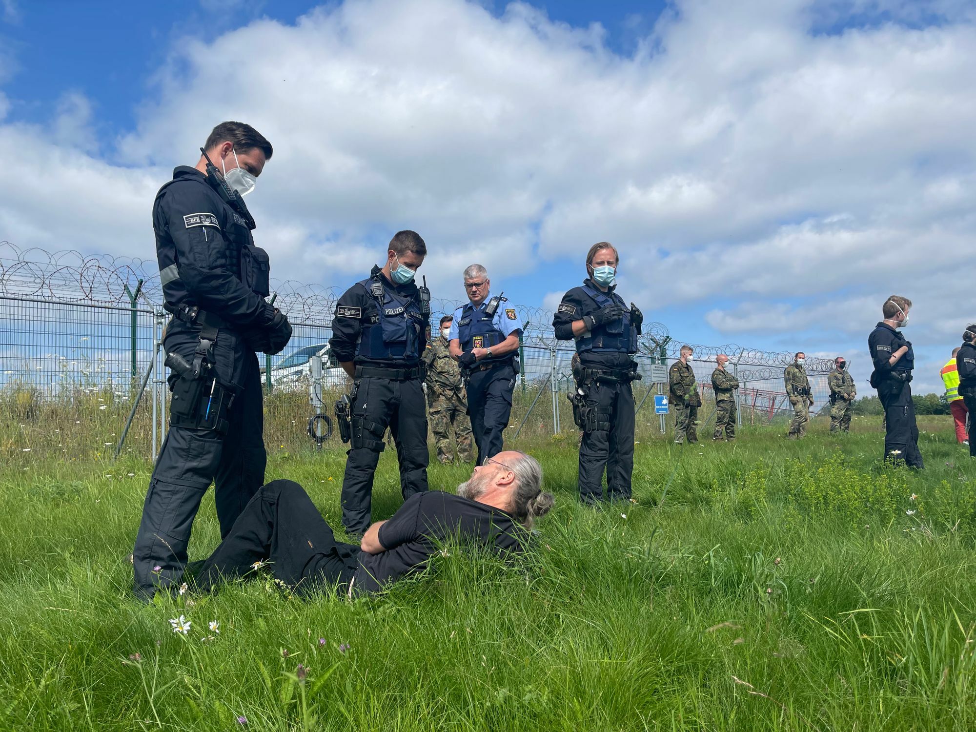 Am Montag haben sechs Friedensaktivisten aus den USA, den Niederlanden und Deutschland eine Aktion unter dem Motto »Stoppt die nächste Katastrophe – Atomwaffen abschaffen!« Die Aktivisten wollten einen Tunnel graben, um auf die Startbahn des Fliegerhorstes Büchel zu gelangen, um den Flugbetriebzu stoppen. »Wir sind uns bewusst, dass in dieser Region jetzt viele Menschen unter der Flutkatastrophe leiden und Hunderte zu Tode gekommen sind. Wir trauern mit ihnen und sind fassungslos angesichts der Zerstörungen«, sagt Christiane Danowski aus Dortmund. »Und dennoch gehen wir zum Fliegerhorst, um auf die Gefahr einer nächsten Katastrophe aufmerksam zu machen, die mit diesen Atomwaffen vorbereitet wird«, ergänzt Brian Terrell aus Iowa, USA. »Wir müssen dieses Signal aussenden: Stoppt die nächste Katastrophe, bevor sie passiert!« »Die atomare Katastrophe, die uns durch die Waffen hier droht, hätte ungleich größere Ausmaße. Wir werden täglich damit bedroht, dass hunderttausende oder sogar Millionen Menschen durch den Einsatz von Atomwaffen zuTode kommen könnten«, sagt Dennis DuVall, 79-jähriger Veteran des US-Militärs und Friedensaktivist aus Dresden. »Diese Gefahr ist real, auch wenn wir sie nicht wahrhaben wollen. Die Weltuntergangsuhr des internationalen ,Bulletin of the Atomic Scientists‘ steht aufgrund der zunehmenden globalen Spannungen bei 100 Sekunden vor Mitternacht!«, ergänzt DuVall. Sigrid Eckert-Hoßbach aus Hessen ist Rollstuhlfahrerin. Sie bekräftigt: »Mein Rollstuhl hält mich nicht davon ab, hier gegen die Kriegsvorbereitungen aktiv zu werden – gewaltfrei, aber entschlossen.«