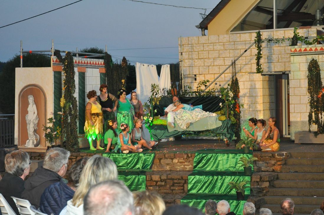 Der Kaisersescher "Sommernachtstraum" ist ein Spagat zwischen Tradition und Moderne. Da dürfen die Zuschauer nicht überrascht sein, wenn Elfenkönig Oberon mit dem Motorrad heranrauscht. Dafür ist das ewig junge Thema Liebe und die daraus entstehenden Verwirrungen durchaus in der Tradition der Welt William Shakespeares. Stephan Hilken als Regisseur und Kirsten Roscher als Dramaturgin haben es aber geschafft, die Dialoge in einer modernen und spitzigeren Sprache zu fassen. Dass Hilken als Weber Zettel auch noch eine der profiliertesten Rollen verkörpert und diese mit großer Spielfreude auf die Bühne bringt, gehört zu den Höhepunkten der Inszenierung, die immer wieder zu Szenenapplaus animierte. Das Kaisersescher Freilichttheater lebt aber auch von einer ungeheuren Leichtigkeit des Ensembles. Egal, ob vor der Aufführung oder in der Pause, die Schauspielerinnen und Schauspieler mischen sich unter das Publikum. Und darunter leidet die Spielleistung nicht, sondern es scheint die Akteure eher noch zu beglügeln. Die Premiere hat in jedem Fall gepasst. "Ich glaube es war schon richtig gut. Ein Versprecher und das wars", lachte "Oberon" Thomas Ellerich. Die weiteren Aufführungstermine: 14., 20., 21., 27. und 28. Juli, jeweils 20 Uhr. Karten: Sportstudio, Buchhandlung Walgenbach (beide Kaisersesch), Buchhandlung Layaa-Laulhé (Cochem) und online www.theater-kaisersesch.de Foto: Pauly