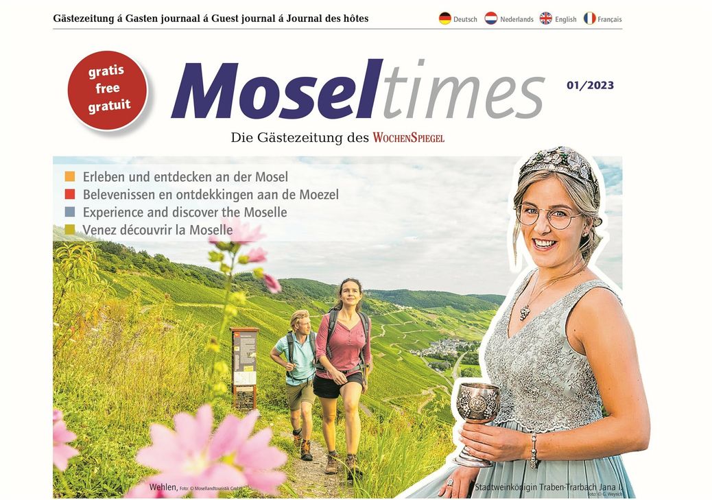 Die neue Ausgabe unserer Gästezeitung gibt es ab sofort wieder wie gewohnt bei den Tourist-Informationen entlang der Mosel, sowie in vielen Restaurants und Hotels zur kostenlosen Mitnahme. Hier finden Sie zahlreiche Ausflugstipps in und rund um die schöne Moselregion für Groß und Klein. Das E-Paper können Sie unter https://wi-paper.de/show/c86423d995a7/epaper lesen.