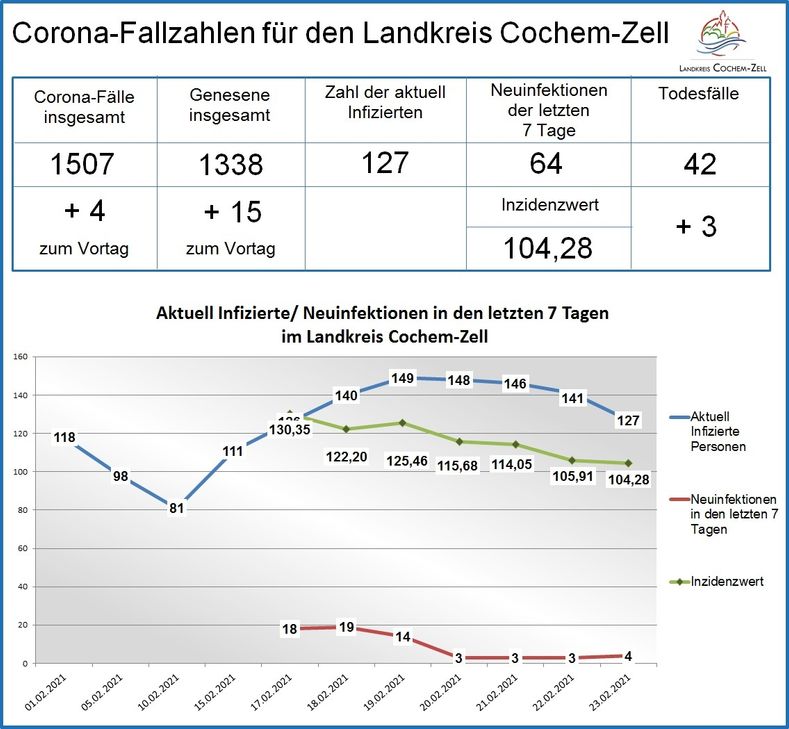 Insgesamt drei weitere Corona-Tote meldet das Gesundheitsamt Cochem-Zell soeben. Hierbei handelt es sich laut Kreisverwaltung um eine 79-jährige und eine 88-jährige Frau sowie einen 71-jährigen Mann aus der Verbandsgemeinde Zell.  Nach WochenSpiegel-Informationen waren alle drei Verstorbene Bewohner eines Seniorenheimes. Der Inzidenzwert ist im Kreis Cochem-Zell weiterhin hoch, aktuell liegt er bei 104,28. Zum Vergleich: Im Landesdurchschnitt liegt er bei 52. In den vergangenen 24 Stunden wurden vier neue Corona-Fälle im Kreis Cochem-Zell registriert.