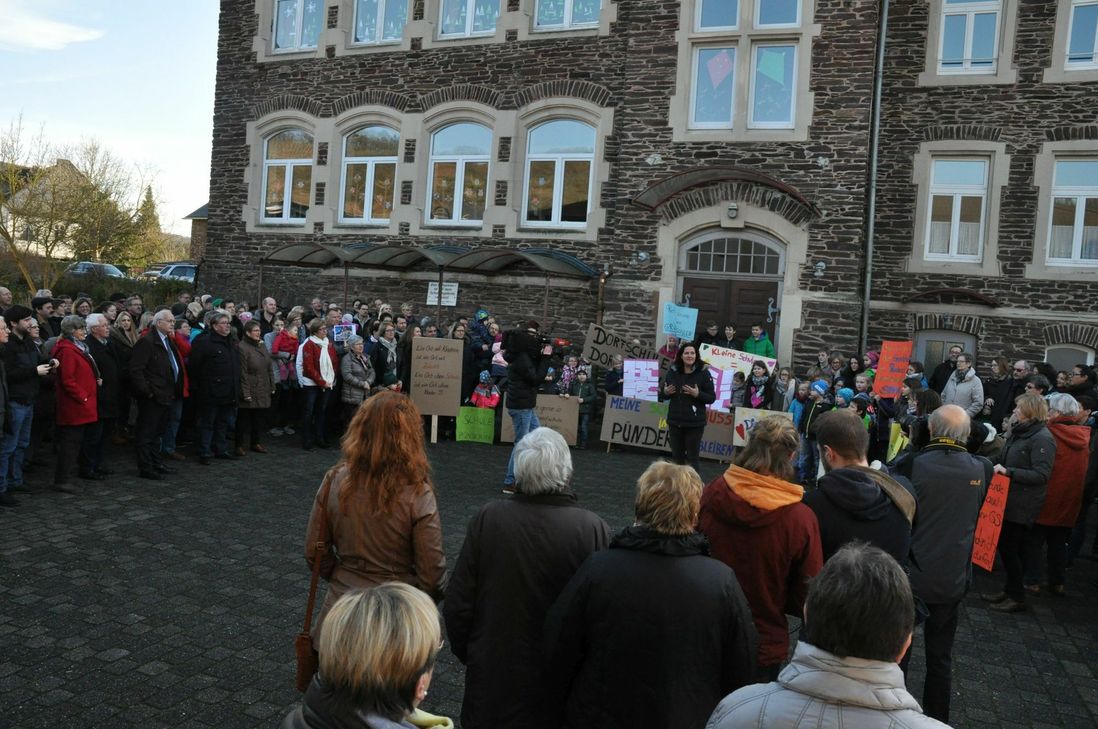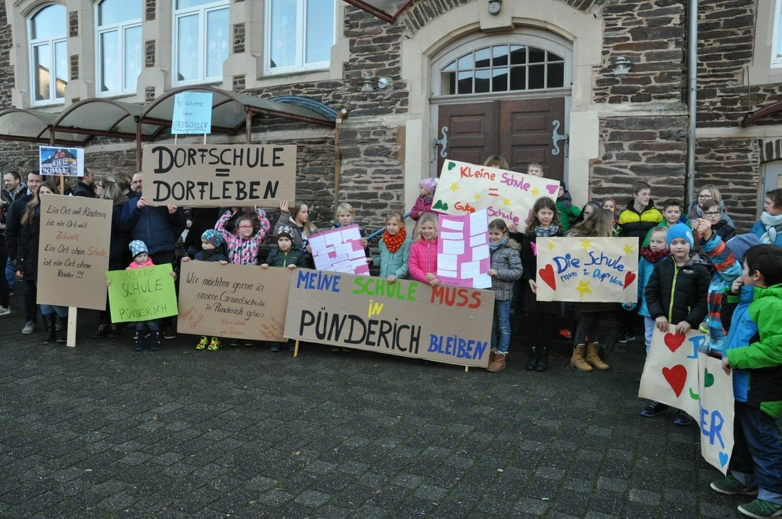 "Schulen dürfen kleiner sein", skandierten die Schülerinnen und Schüler der Grundschule Pünderich. Das hofft auch die Schulelternsprecherin Heike Lenz. "Ich gebe die Hoffnung erst auf, wenn die Schließung schriftlich bestätigt ist", sagt die Mutter von zwei Schulkindern, die von der großen Solidarität der Pündericher angetan ist. "Ich könnte niemanden nennen, der bei unserer Unterschriftenaktion nicht mitgemacht hat", so die Schulelternsprecherin, die auch in VG-Bürgermeister Karl Heinz Simon einen großen Unterstützer hat. "Die Aufsichts- und Dienstleistungsdirektion (ADD) ist von einer falschen Schulbindungsquote ausgegangen - zu unseren Ungunsten. Kinder aus Briedeler Heck und Meiermund gehen in Büchenbeuren und Sohren zur Schule und das ist ja auch sinnvoll. Zudem ist die ADD von falschen Schülerzahlen ausgegangen, die wir belegen konnten. Auf das Ergebnis der Prüfung warten wir noch", erklärte Simon, der im Fall der Fälle als Schulträger auch den juristischen Weg beschreiten will. "Seit Ende des vergangenen Jahres ist die Schule in Pünderich auch eine Betreuende Grundschule", so der Bürgermeister, der mit dieser Vorgabe auch eine Attraktivitätssteigerung der Grundschule verbindet. Rund 80.000 Euro pro Jahr nimmt die VG dafür jährlich in die Hand - einstimmig im VG-Rat verabschiedet. Im aktuellen Haushalt sind zudem 65.000 Euro für Sachkosten der Schule eingestellt, die nicht nur Simon gerne ausgeben würde. "Weil uns dies Schule das wert ist", fasst es der VG-Bürgermeister. Foto: Pauly