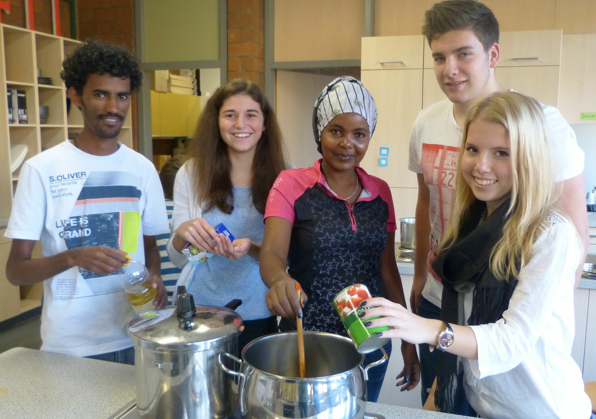 Die Schüler hatten sich das gewünscht, nachdem ihnen Frezghi Yemane einige Tage zuvor im Unterricht von seiner Flucht nach Europa erzählt hatte. Der junge Mann wohnt zurzeit in Liesenich. Die Diktatur in Eritrea hatte ihm das Leben schwer gemacht und ein lebenslanger Wehrdienst stand dem Studenten bevor. Seine Flucht nach Europa kostete ihn 6.000 Dollar und dauerte neun Monate. Drei Monate davon verbrachte er in einem Gefängnis in Libyen, aus dem er nur durch Bestechung entkommen konnte. Als die Schüler mit der Idee zu ihm kamen, mit ihm gemeinsam ein Gericht aus Eritrea zu kochen, bat er Senhar Andemariam, die ebenfalls nun in Liesenich lebt, um Hilfe. "Und es hat auch richtig gut geschmeckt!", berichtete ein Schüler später. Foto: privat www.igszell.de