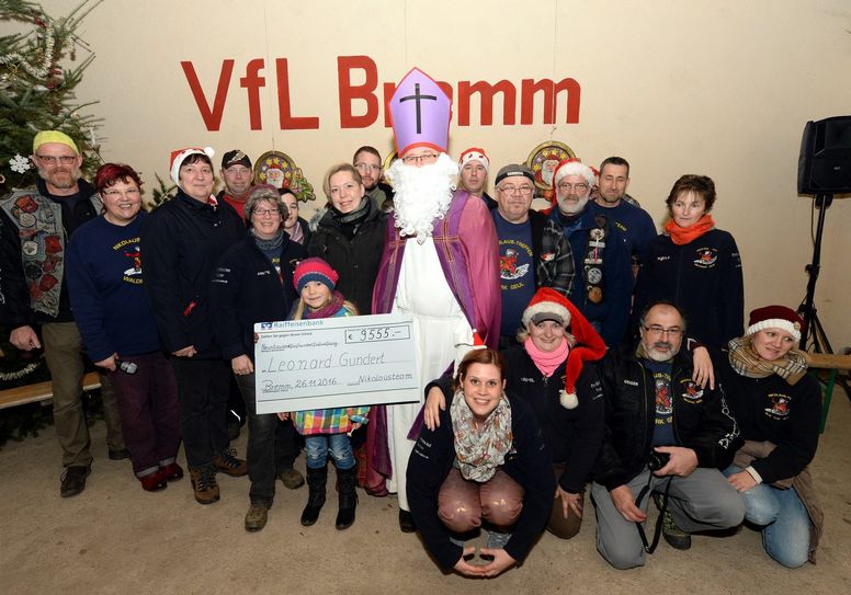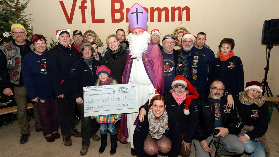Nach der Gründung des "Teams«" schlossen sich weitere Biker aus St. Aldegund und Bullay an. Das Nikolaus-Team hat es sich unter anderem zur Aufgabe gemacht, behinderten Jungen und Mädchen aus der näheren Region finanzielle Hilfe zukommen zu lassen. Alljährlich findet auf dem Waldplatz »Geul« bei Bremm ein Bikertreffen mit befreundeten Motorradclubs statt. Leckere Speisen und Getränke lassen weder Durst noch Hunger aufkommen. Dazu kommt auch der Nikolaus auf einem motorisierten Zweirad. Im Laufe des abgelaufenen Jahres sind weitere Aktionen und Veranstaltungen für den guten Zweck durchgeführt worden, deren Erlöse ebenfalls in den großen Spendentopf wanderten. Zudem hatte das Team in vielen Geschäften Sammelbüchsen aufgestellt. Jeweils zum 1. Advent werden die Kinder beschenkt. In den 15 bisherigen Auflagen hat das Team über 74.000 Euro gesammelt und an Betroffene übergeben. So auch in diesem Jahr. Der neunjährige Leonard Gundert aus Illerich wurde von dem Nikolausteam mit 9.555 Euro bedacht, dem höchsten Einzelbetrag der je übergeben werden konnte. Durch eine Tetraspastik ist Leonard mit der Lähmung von Armen und Beinen betroffen. Auch die sprachliche sowie motorische Entwicklung ist damit verzögert. Seine Mutter Stefanie und seine Schwester Emilia nahmen den stolzen Scheck entgegen. Leonard war erkrankt und konnte so nicht anwesend sein. Einen besonderen Wunsch des Jungen hat seine Mutter verraten, er wünscht sich einen Begleithund, der ihn bei Alltäglichem unterstützen kann. Unter Tränen bedankte sich Stefanie Gundert beim Bremmer Nikolausteam für die große Hilfe. Auch im kommenden Jahr wird es wieder eine Aktion des Teams geben. Für 2017 haben die Biker mit Herz Hannes Waller aus Pünderich ausgewählt. Foto: Peter Scherer www.nikolaus-team-bremm.de