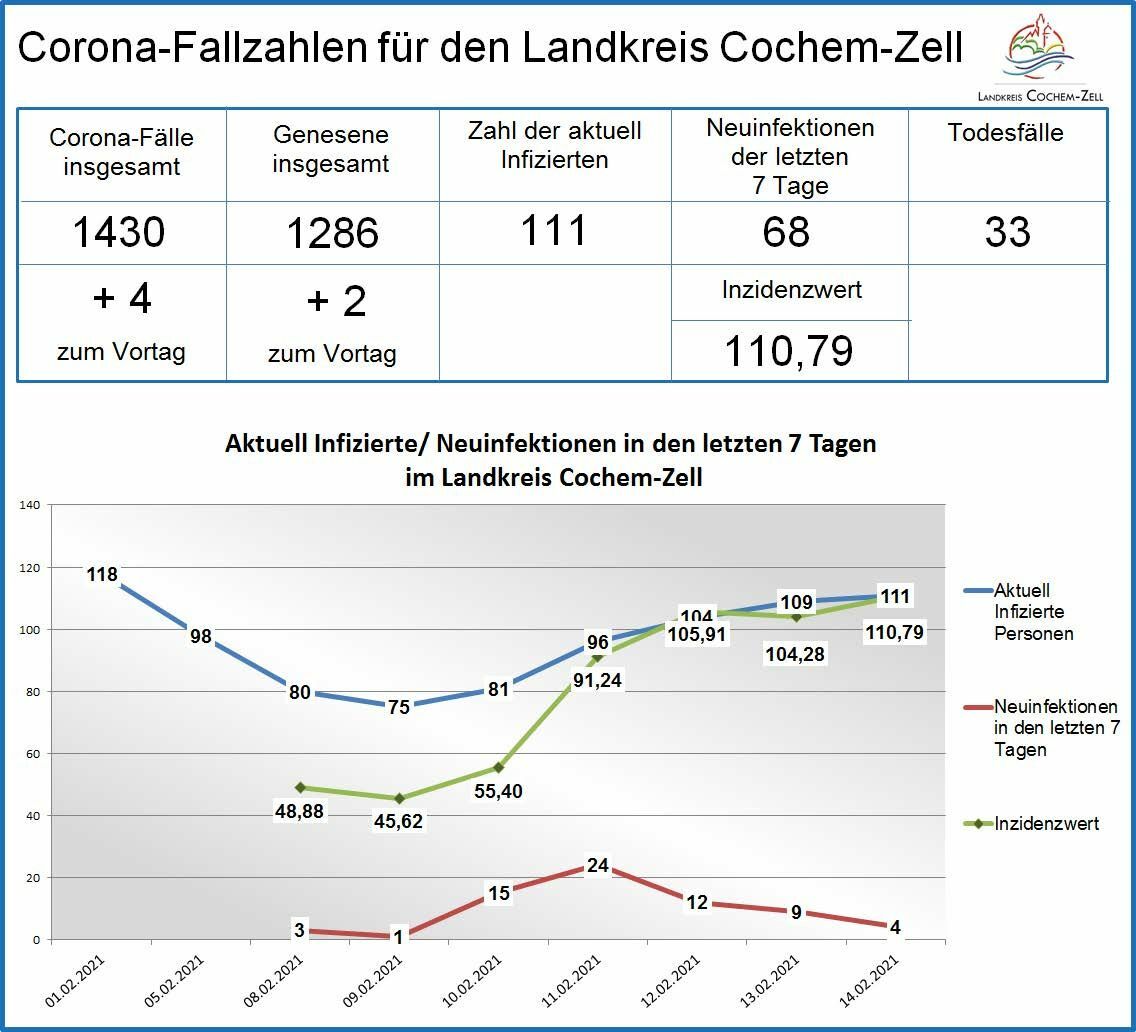 Die Corona-Zahlen in Deutschland gehen weiter zurück. Die sogenannte Sieben-Tage-Inzidenz - also die Zahl der Neuinfektionen bezogen auf 100.000 Einwohner in den zurückliegenden sieben Tagen – liegt in Deutschland aktuell bei 57. Im Kreis Cochem-Zell hingegen liegt sie mehr als doppelt so hoch, nämlich bei 110,79 (Stand: Sonntag, 14. Februar, 11 Uhr). Das ist laut einer Statistik des Landesuntersuchungsamtes Rheinland-Pfalz der einzige Wert in unserem Bundesland der im dreistelligen Bereich liegt. Auf Landesebene liegt der Inzidenzwert heute bei 46,6. Die Zahlen unserer direkten Nachbar-Landkreisen liegen noch deutlich niedriger. Im Kreis Bernkastel-Wittlich liegt der Wert lediglich bei 27,6 im Kreis Mayen-Koblenz bei 39,6. Weitere Info: https://lua.rlp.de/de/presse/detail/news/News/detail/coronavirus-sars-cov-2-aktuelle-fallzahlen-fuer-rheinland-pfalz/ Grafik: Kreisverwaltung Cochem-Zell www.cochem-zell.de