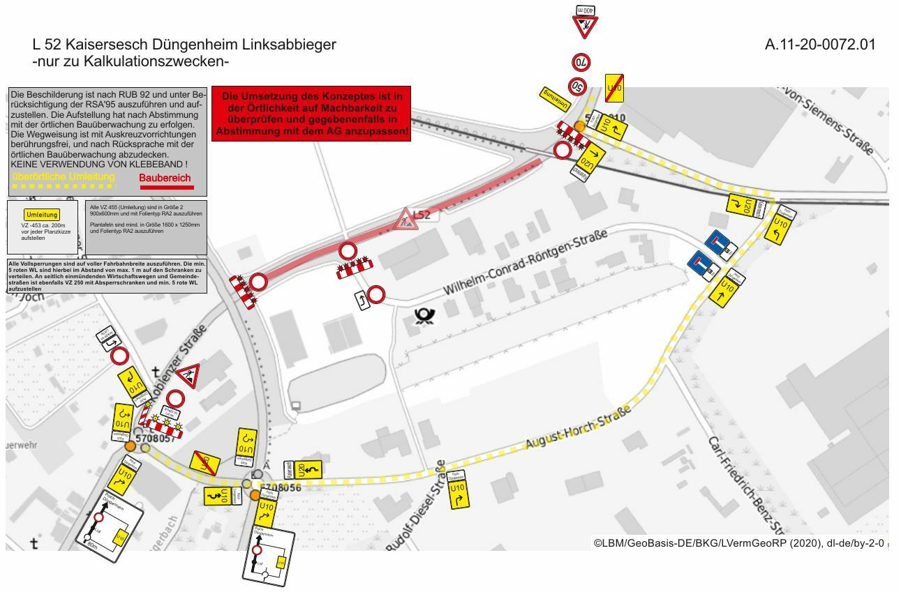 Mit der Erschließung des Gewerbegebietes verbunden ist der Neubau einer Einmündung in die L 52. Zur verkehrssicheren Anbindung wird die L 52 auf einer Länge von rund 300 Metern im Vollausbau erneuert und um eine Linksabbiegespur erweitert. Weiterhin wird bis zur Einmündung in das neue Gewerbegebiet ein Gehweg angelegt, der mit einer neuen Querungshilfe an den bestehenden Gehweg in der Wilhelm-Conrad-Röntgen-Straße anschließt. Im 1. Bauabschnitt erfolgen nach Ostern die Arbeiten an der L 52. Die Bauzeit beträgt hierfür rund drei Monate. Im Anschluss an den Ausbau der L 52 erfolgt dann im 2. Bauabschnitt die eigentliche Erschließung des Gewerbegebietes. Die Arbeiten an der L 52 erfolgen unter Vollsperrung. Der Verkehr wird von Kaisersesch aus über die August-Horch-Straße und die K 21 bis zur L 52 umgeleitet. Von Düngenheim aus erfolgt die Umleitung entsprechend in der Gegenrichtung. Die Baukosten für die Erneuerung der L52 und die neue Anbindung an das Gewerbegebiet betragen rund 265.000 Euro. Hierbei trägt die Stadt Kaisersesch die Kosten für die neue Linksabbiegespur sowie für den Gehweg. Es sei sinnvoll, so der Landesbetrieb Mobilität (LBM) Cochem-Koblenz, im Rahmen dieser Maßnahme gleichzeitig die Restflächen an der Landesstraße grundhaft zu erneuern; die Kosten dafür werden vom Land Rheinland-Pfalz getragen. Fotos: Pauly / LBM www.lbm.rlp.de