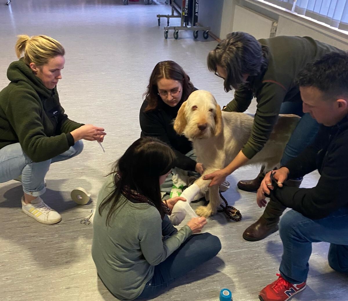 Im Seminar vermittelte Judith Pompa den Teilnehmern die Erkennung von Notfällen sowie die Durchführung von Erste Hilfe-Maßnahmen. Praktische Übungen an fünf Hunden, bei denen unter anderem die Vitalwerte wie Puls überprüft oder die Lymphknoten gesucht wurden, ergänzten den theoretischen Teil. Die Hundetrainerin Carina Fischer von der Hundeschule Blankenrath und Maike Bigos von „Moselschnauzen" waren ebenfalls anwesend und zeigten sich begeistert von der Möglichkeit, das Gelernte direkt an lebenden Tieren umzusetzen. Mit Michaela Schneider war eine weitere Hundetrainerin zugegen, die den entspannten Vierbeiner Coco (Spinone Italiano) als Übungshund zur Verfügung stellte.