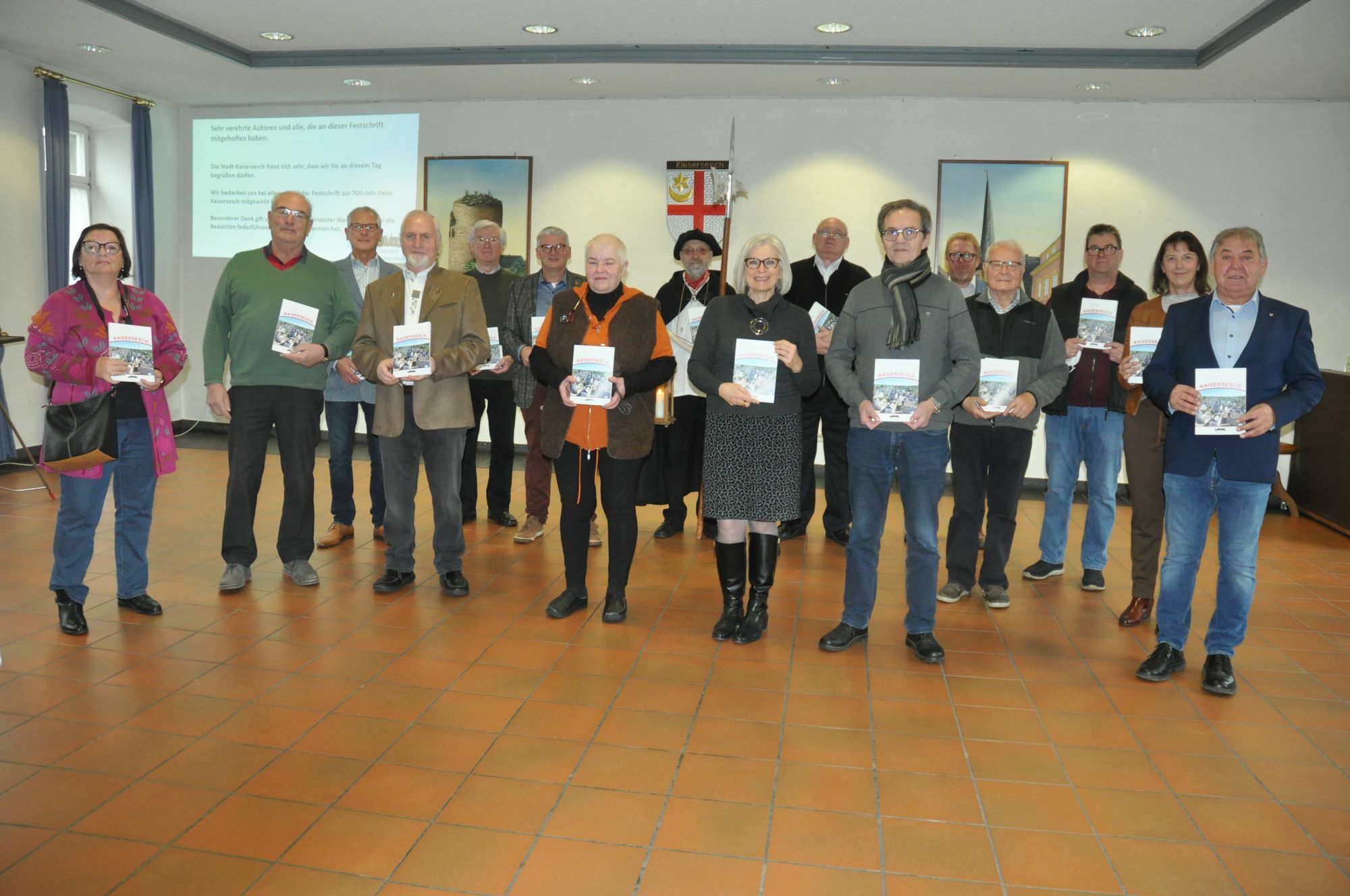 Die "Escher" hatten sich das Jubiläumsjahr "700 Jahre Kaisersesch" ganz anders vorgestellt, als es Corona letztlich zuließ. Man hat das Mögliche möglich gemacht, aber viele Veranstaltungen mussten, ob der Einschränkungen, die die Pandemie mit sich brachte, abgesagt werden. Das galt zumindest nicht für die Festschrift zum Jubiläum, die jetzt vorgestellt wurde. Kein reiner Rückblick, sondern viel "Gefühl" "Es ist ein gelungenes Werk", stellte Stadtbürgermeister Gerhard Weber gerne fest, der bei der über 200 Seiten starken Festschrift von einem Dokument der Kaisersescher Geschichte sprach. Dabei ist es beileibe nicht nur ein historischer Rückblick auf sieben Jahrhunderte Stadtgeschichte, die 1997 mit der erneuten Verleihung sozusagen in die zweite Runde ging. Damals war Werner Lutz Stadtbürgermeister. Der ehemalige Lehrer war heuer für die Erstellung der Jubiläumsschrift verantwortlich. "Es sollte kein historischer Rückblick sein, sondern ein 'Feeling' unserer Heimat wiedergeben", beschrieb Lutz den Ansatz mit dem er an die Umsetzung herangegangen ist. Dabei herausgekommen ist ein vielfältiges Werk, dass Geschichten aus der Eifelstadt in unterhaltsamer Form zusammenführte. Da gibt es beispielsweise Anekdoten über eine einst existierende "Saufliste", über das "Escher" Nationalgericht "Schlottes Matsch" oder eine geklaute Fleischwurst. Darüber hinaus hat auch Lyrisches Einzug in die Jubiläumsschrift gefunden. Beispiele: "Ett aale Kino, enn Escher Platt" von Karl Braunschädel oder das Loblied an Kaisersesch von Konrad Fuhrmann. Darüber hinaus nimmt auch die Gegenwart der Stadt einen großen Raum ein. Von der Wirtschaft über die Vereine, Kirchen bis hin zur Schullandschaft wird die aktuelle Situation in den Fokus gerückt. Eine reich bebilderte Jubiläumsschrift Die Festschrift ist aber alles andere als eine "Bleiwüste". Karl-Heinz Berg hat hunderte von Fotos zusammengetragen und die Artikel reich bebildert. "Ich habe es mir einfacher vorgestellt. Da steckt viel Arbeit und Zeit drin", schmunzelte Berg, dem man aber wie allen ansehen konnte, dass die Jubiläumsschrift gelungen ist und sicher "ein schönes Weihnachtsgeschenk" wäre... Die Festschrift ist zum Preis von zehn Euro in der Buchhandlung Walgenbach und im Stadtbüro erhältlich. Foto: Pauly www.stadt-kaisersesch.de