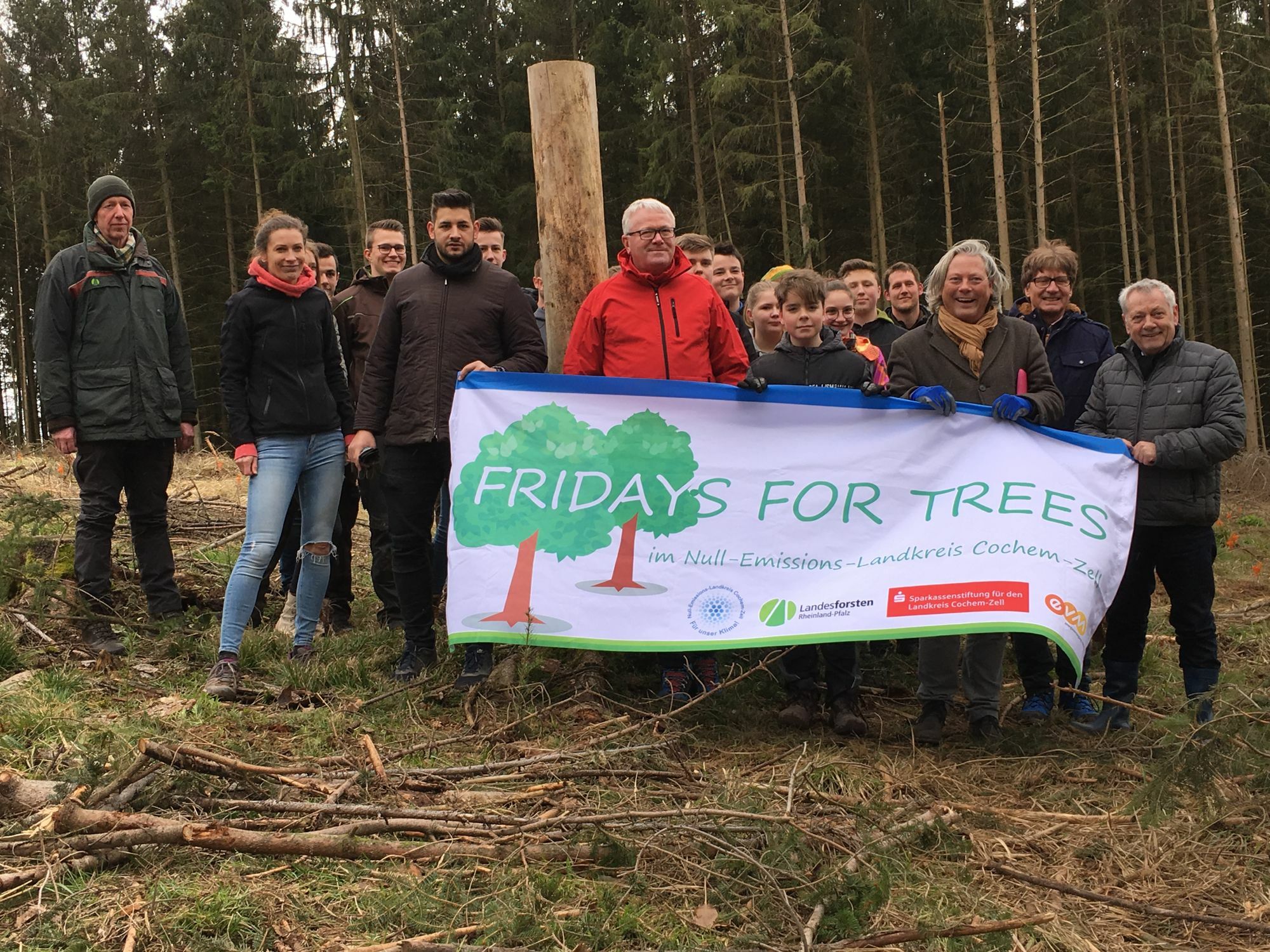 Ende des vergangenen Jahres hat Landrat Manfred Schnur die Schulen in Trägerschaft des Landkreises Cochem-Zell aufgerufen, sich an dem Projekt "Fridays for Trees" zu beteiligen. Die Idee, die "Fridays-for-future"-Bewegung um Klimaschutzaktionen in der Region zu erweitern, stieß bei den umweltinteressierten Schülerinnen und Schülern der Konrad-Adenauer-Schule auf großes Interesse. Dem Aufruf folgten die Klasse 10 und mehrere Schüler der Umweltgruppe. Nachdem der Weg zur Pflanzfläche in Nähe der "Leppertshütte" klimaneutral "erwandert" war, konnte die Bepflanzung unter fachkundiger Anleitung erfahrener Forstwirte durchgeführt werden. Landrat Manfred Schnur bedankte sich persönlich vor Ort für das Engagement der Schulgemeinschaft. Mit dieser Aktion hat sich die Anzahl der durch Schülerinnen und Schüler der Konrad-Adenauer-Schule gepflanzten Bäume auf über 1.400 erhöht - Tendenz weiter steigend. Foto: privat www.schulen-treis-karden.de