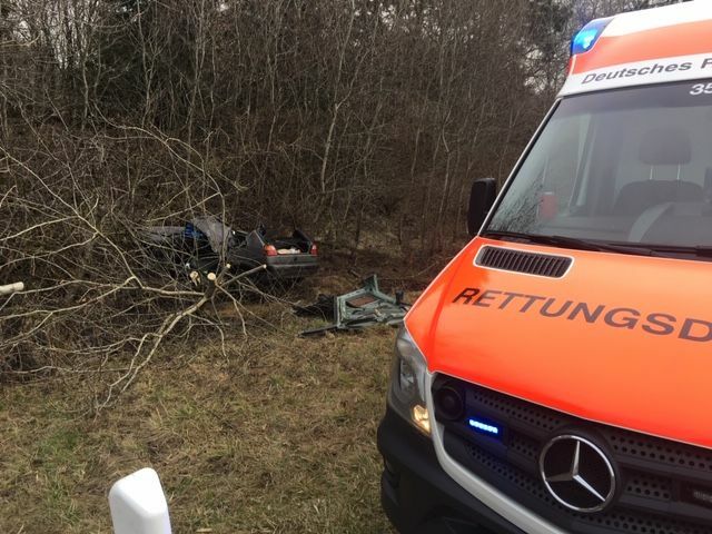 Ein Mann kam mit seinem Auto aus ungeklärter Ursache in den Straßengraben und prallte gegen einen Baum. Er musste von der Feuerwehr aus dem Fahrzeug befreit werden. Die L 52 war während der Rettungsarbeiten voll gesperrt.  Foto: Zender