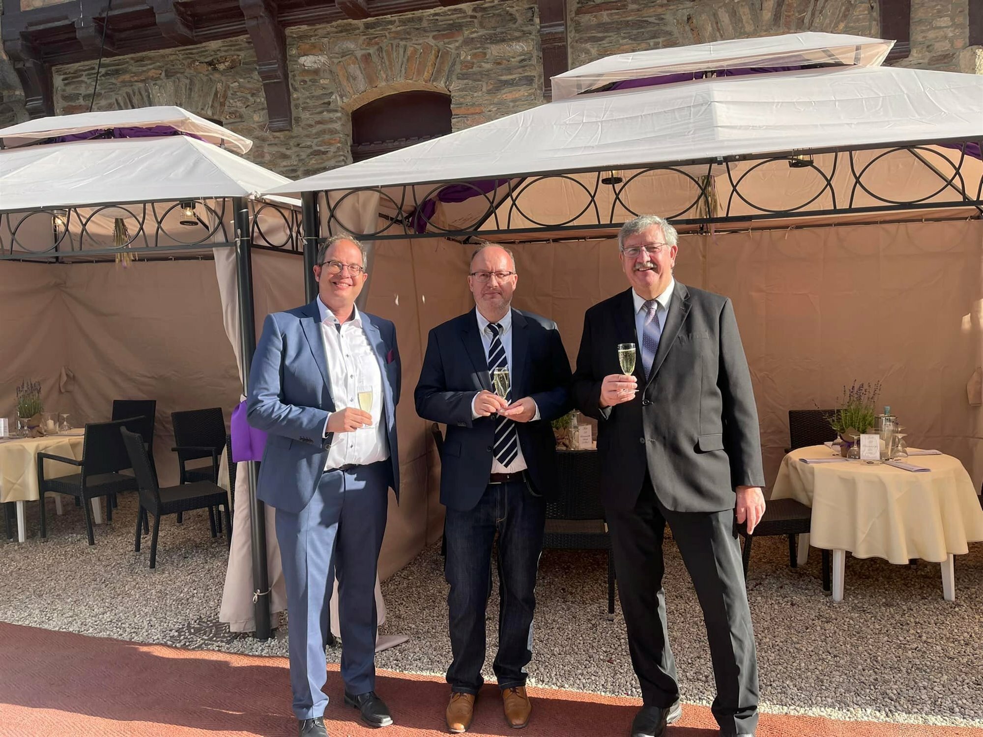 Was für ein schöner und gelungener Abend: Zehn Restaurants und zehn Winzer begeisterten vergangene Woche die Gäste beim Gourmetfest "Historisches und Genuss" auf der Reichsburg in Cochem. Bei tollem Wetter konnte Moderator Stefan Pauly rund 380 Feinschmeckerinnen und Feinschmecker im historischen Innenhof der Reichsburg begrüßen. Burgchef Oliver Pinzer und sein Team hatten das Cochemer Wahrzeichen mit viel Engagement in ein geschmackvoll gestaltetes Freiluft-Restaurant verwandelt. Hoch über der Moselstadt präsentierten zehn Restaurants ganz unterschiedliche Gerichte. Dazu gesellten sich Moselwinzer, die jeweils einen passenden Wein zu den Speisen ausschenkten. Und die Gäste waren begeistert. Stadtchef Walter Schmitz: "Es ist beeindruckend, wie viele tolle Betriebe es in unserer Region gibt". Das vom Cochemer Wochenspiegel präsentierte Gourmetfest fand in diesem Jahr bereits zum 20. Mal statt. Auch WochenSpiegel-Chefredakteur Mario Zender war begeistert. "Besonders freut es mich, dass so viele junge Moselwinzerinnen und -winzer, sich und ihre Betriebe hier präsentierten." Viel Lob gab es von den Teilnehmern auch für den reibungslosen Ablauf des Festes, wofür das Burg-Team um Oliver Pinzer verantwortlich war. Viele Fotos des Gourmet-Events gibt es im Internet auf unserer Webseite unter: www.wochen spiegllive.de Von links: Moderator Stefan Pauly, Burgchef Oliver Pinzer, Stadtchef Walter Schmitz, Weinhoheiten Lisa und Gina, sowie WochenSpiegel-Chefredakteur Zender.