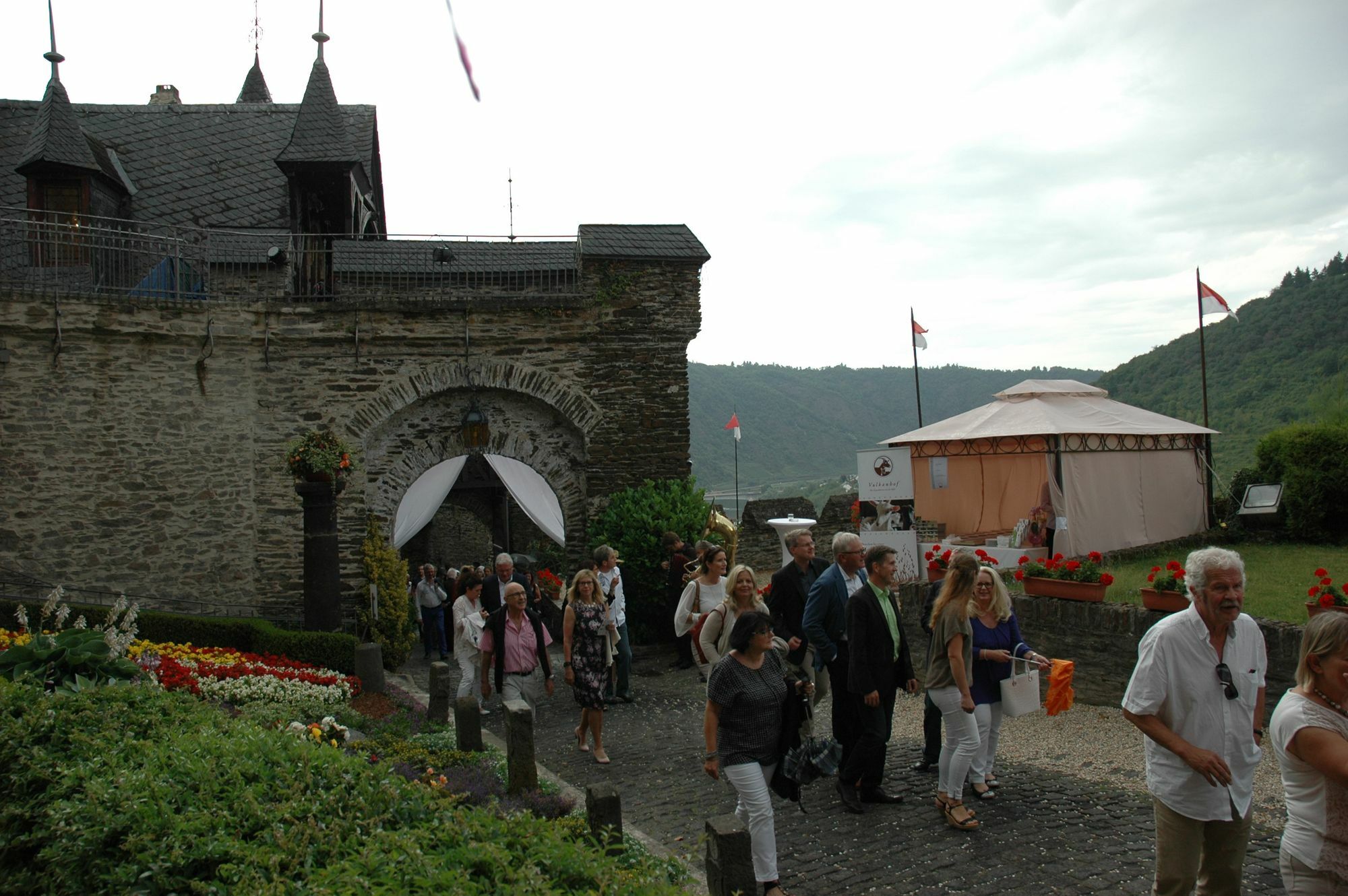 Torwächter in edlen Gewändern öffneten die großen, hölzernen Tore der Burg. Angeführt von Dirko Juchem und seinen Musikern, wurden die Gäste zum Ort der Genüsse geleitet. Der Erfolg des Festes, das seit 2001 auf der Reichsburg Genießer, Köche und Winzer zusammenführt, kommt nicht von ungefähr. Das spätgotische Bauwerk, die exquisiten Speisen, edle Tropfen und die Musik von "Swing Gourmet" und "Club Cats" schaffen eine unvergleichliche Atmosphäre. Nach einem kulinarischen und prickelnden Auftakt, konnten sich die Gäste aus drei Vorspeisen, vier Hauptspeisen, drei süßen Versuchungen und Käsevariationen ihren Gourmet-Fahrplan zusammenstellen. Die Gäste hatten die Gelegenheit von Stand zu Stand zu bummeln und sich durch das lukullische Programm durchzuprobieren. Zu jeder Speise boten Winzer von der Mosel die passenden Tropfen. Darüber hinaus konnten auch edle Brände und Liköre verkostet werden. Sogar Petrus hatte ein Herz für die Genuss-Freunde, denn alle Unwetter machten einen Bogen um die Reichsburg. Wer das "Fest für alle Sinne" genießen möchten, der erhält Tickets für die nächsten Veranstaltungen unter: www.burg-cochem.de Fotos: Wicher