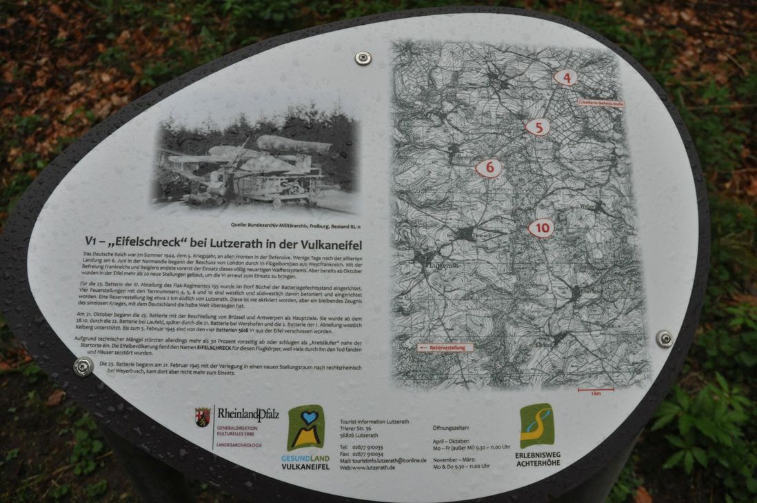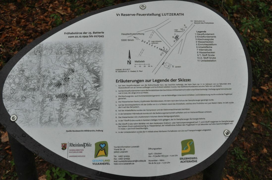 2017 wurde die V1-Station im Lutzerather Wald vom Archäologen der Landesarchäologie und Lutzerather Gemeindearbeitern freigelegt. Unter der Anleitung der Freizeit-Militärhistoriker Wolfgang Gückelhorn, Detlev Paul, Olaf Göbel und Volker Pelz, die alle ehrenamtlich für die Aufarbeitung der jüngeren deutschen Geschichte arbeiten, wurde die "Eifelschreck"-Station gut sichtbar und begehbar gemacht. Die Zeichnung und der Text der Infotafeln stammen von Detlev Paul und Wolfgang Gückelhorn. Bei der Tafel für die Römergräber hat Dietmar Grewenig den Text erstellt und bei der Darstellung der Zeichung mitgewirkt. Der Tourismus- und Gewerbeverein Lutzerather Höhe hat die Kosten in Höhe von 2.000 Euro getragen und die Tafeln aufgestellt. Fotos: privat, Pauly (3) www.lutzerath.de