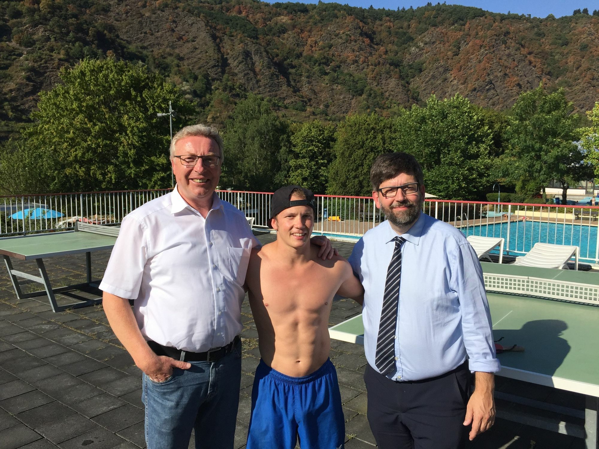 Moselbad-Geschäftsführer Bernd Schuwerack und Stadtbürgermeister Wolfgang Lambertz im "Gold-Modus": Olympiasieger Fabian Hambüchen zu Gast im Moselbad.