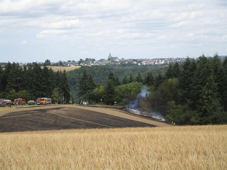 Ein Ausbreiten des Feuers auf ein Waldstück im Bereich der Geierlay-Hängeseilbrücke konnte verhindert werden. Ein Landwirt entdeckte während der Ernte eine leichte Rauchentwicklung, die sich schnell zu einem Großbrand ausdehnte.