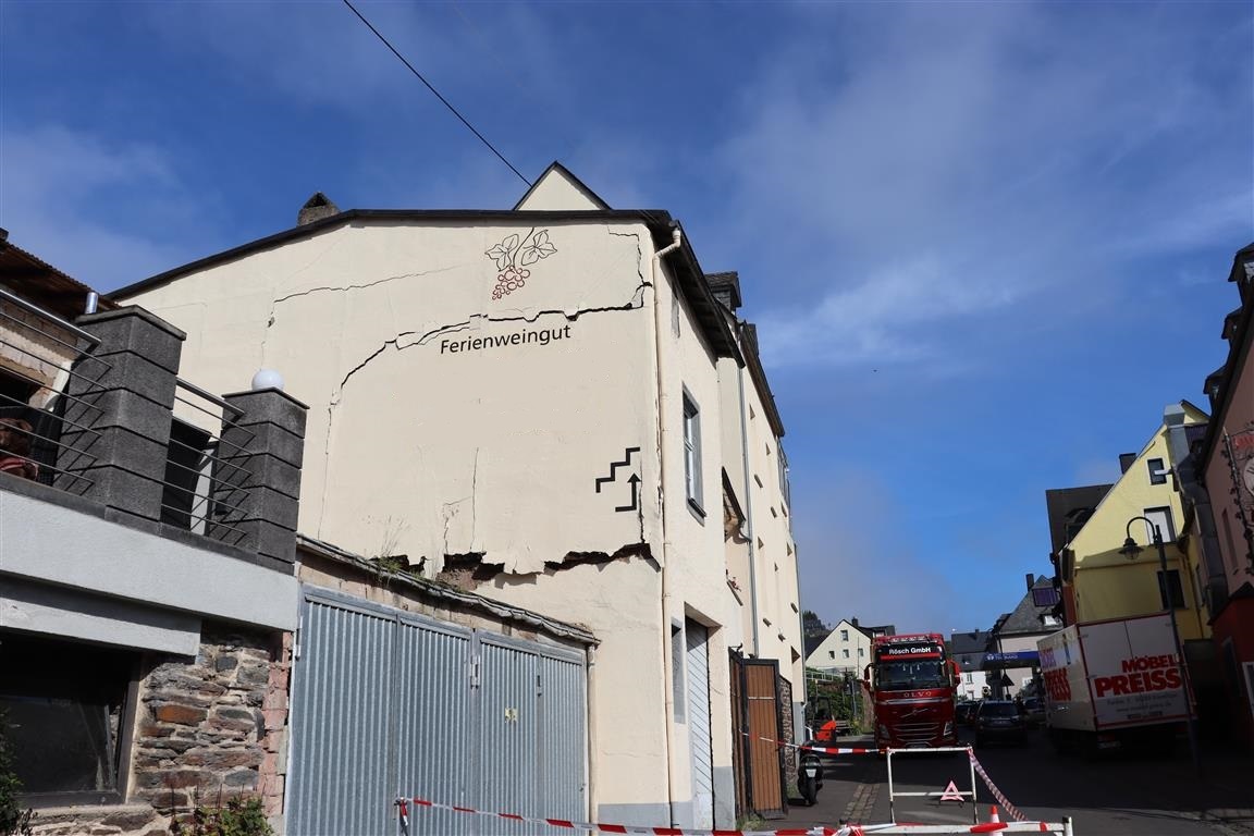 Am Morgen wurde die Polizei Zell darüber in Kenntnis gesetzt, dass in der Bergstraße in Reil eine Hauswand eines Nebengebäudes droht, auf die Straße zu stürzen. Vor Ort konnte festgestellt werden, dass sich eine Seitenwand des Anwesens aus unbekannten Gründen gelöst hat.Durch die Straßenmeisterei wurde eine großräumige Umleitung eingerichtet. Die Bergstraße in Reil ist zurzeit für den Verkehr komplett gesperrt. Durch anwesende Behördenvertreter wurde in Absprache mit dem Hauseigentümer entschieden, dass ein sofortiger Abriss des Anwesens notwendig ist. Im Einsatz befinden sich Kräfte der FFW Reil, KFI der KV BKS-WIL, Wehrleitung der VGV Traben-Trarbach, Vertreter der KV BKS-WIL (Bauaufsicht), des LBM, sowie mehrere Ortsgruppen des THW (Bauchfachberater, Absicherung und Abriss).