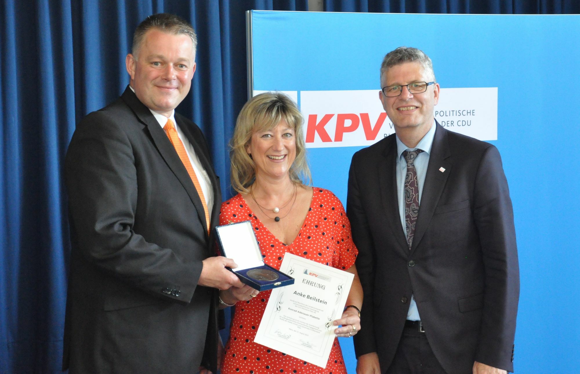 Mit dieser Auszeichnung, die höchstens einmal im Jahr durch den Landesverband vergeben werden kann, sollen Menschen geehrt werden, die sich mit außergewöhnlichem ehrenamtlichem Engagement und über einen längeren Zeitraum hinweg für die Städte Kreise und Gemeinden in Rheinland-Pfalz eingesetzt haben. Anke Beilstein hatte die hohe Ehre, nun als erste Persönlichkeit im Land ausgezeichnet zu werden. "Für mich ist die Kommunalpolitik noch immer die Königsdisziplin in der Politik. Hier gilt es, die Entscheidungen zu treffen, die ganz nah am Menschen sind und niemand kann sich wegducken. Da sind sowohl Standhaftigkeit und wie Kompromissfähigkeit gefragt", so Anke Beilstein. Ausgezeichnet wurde sie für ihr langjähriges, aktives Eintreten für die Interessen der Kommunen. Seit 1998 ist sie Mitglied im Landesvorstand der KPV. Sie stand der kommunalpolitischen Interessenvertretung der CDU Rheinland-Pfalz von 2009 bis 2017 als Landesvorsitzende vor. Foto: KPV www.kpv-rlp.de