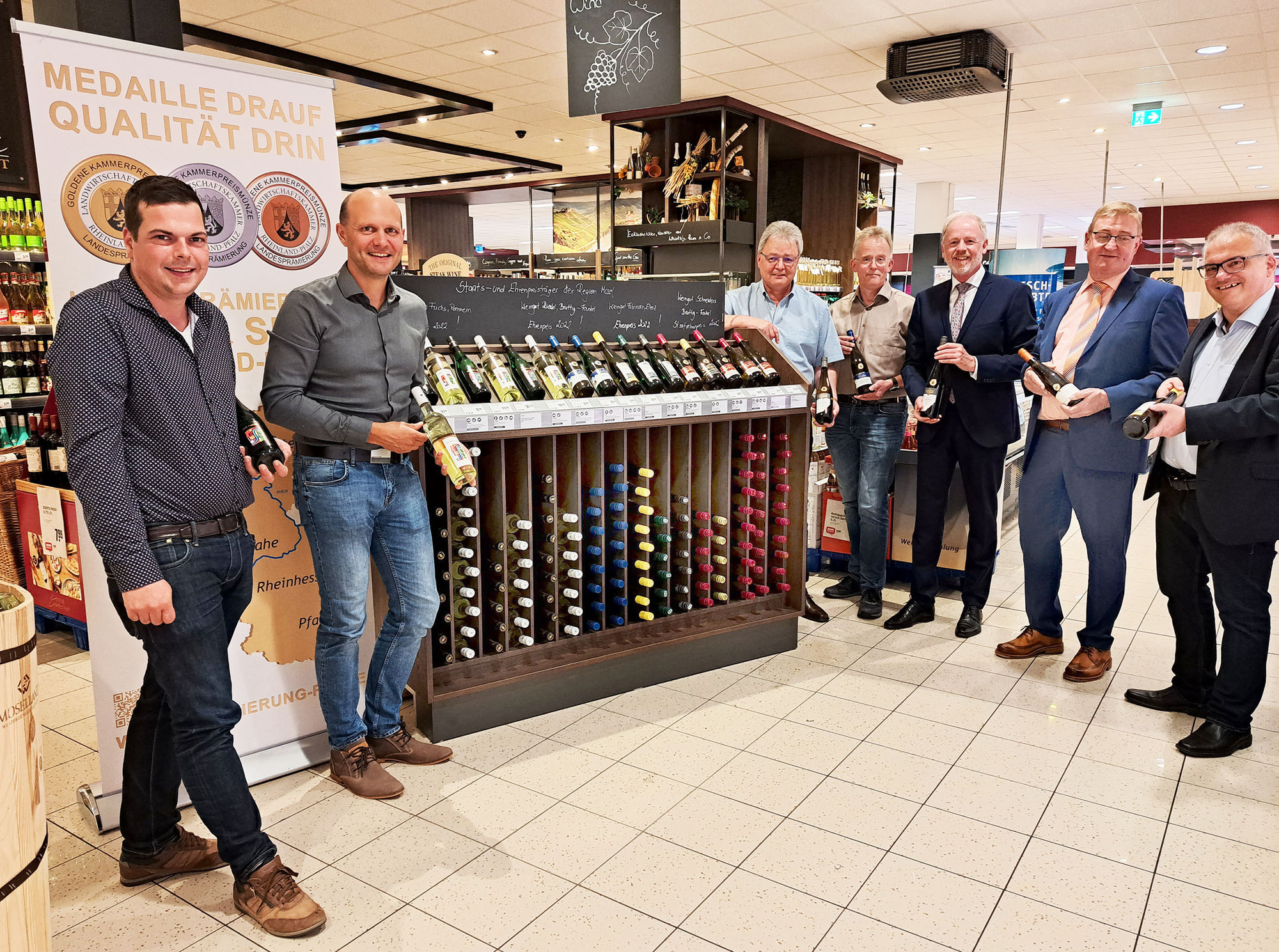 Inzwischen würdigt die REWE:XL Hundertmark in Cochem ihre gelisteten Winzer aus dem Kreis Cochem-Zell, die bei der Landeswein- und Sektprämierung 2022 als Staatsehrenpreis- und Ehrenpreisträger hervorgingen, auf eine ganz besondere Art. So werden die ausgewählten Weine an exponierter Stelle in der Wein- und Spirituosen-Abteilung des Marktes in einem eigens angefertigten Holzregal präsentiert und bieten nach den Worten des Geschäftsführers Björn Hundertmark »für viele unserer Kunden, die eine besondere Qualität wünschen, eine große Einkaufserleichterung«.