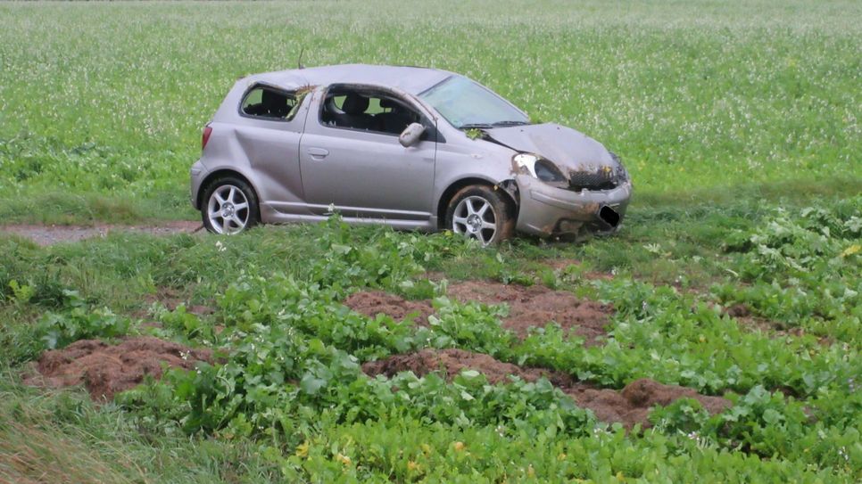 Die junge Frau überschlug sich mit ihrem Auto und landete in einem angrenzenden Feld. Glücklicherweise erlitt sie nur leichte Verletzungen. An ihrem Fahrzeug entstand Totalschaden. Foto: Polizei