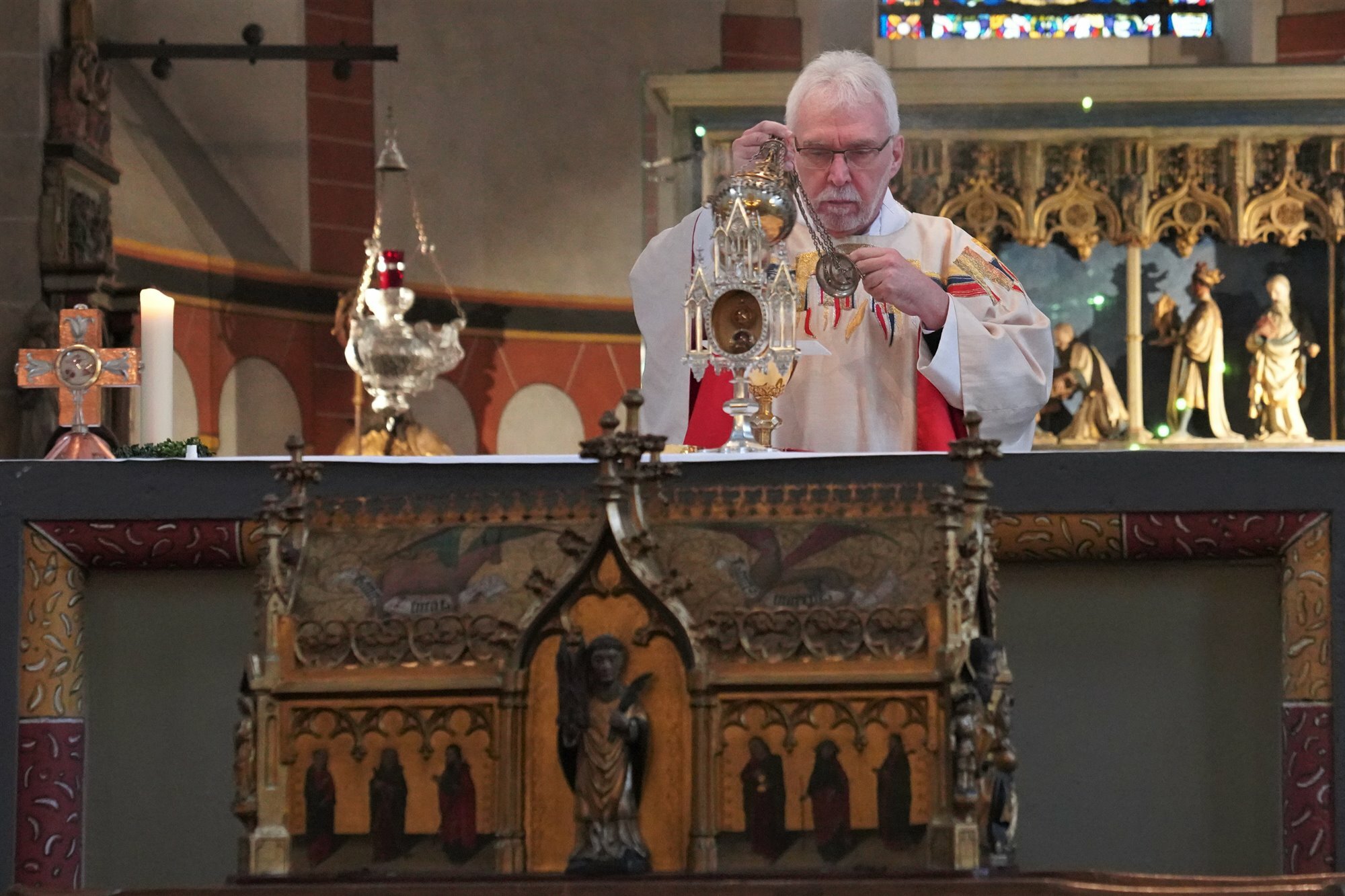 Treis-Karden. Im Rahmen des erstmals nach zweijähriger Coronapause stattgefundenen Castorfests ist der normalerweise in der Castor-Kapelle unter hohen Sicherheitsvorkehrungen befindliche Castor-Schrein traditionell von vier Trägern und von einer Prozession begleitet vor den Zelebrationsaltar der Kardener St. Castor-Kirche gebracht worden. Im Anschluss wurde ein Gottesdienst mit dem Zelebranten, Pastor Hermann-Josef Floeck, gefeiert. Ab Mittag gab es die Möglichkeit unter sachkundiger Führung von Christoph Oster-Daum und Thomas Fischer die Zwerggalerie und die Kirchtürme der St. Castor-Kirche zu erkunden. Auch ein Gang über die beeindruckende Deckenkonstruktion des Langhauses der Kirche gehörte dazu. Zudem hielt Matthias Hochhausen aus Münstermaifeld einen Vortrag, der Einblicke in die Gemeinsamkeiten und Unterschiede der Kollegiatskirchen Karden und Münstermaifeld gab.
