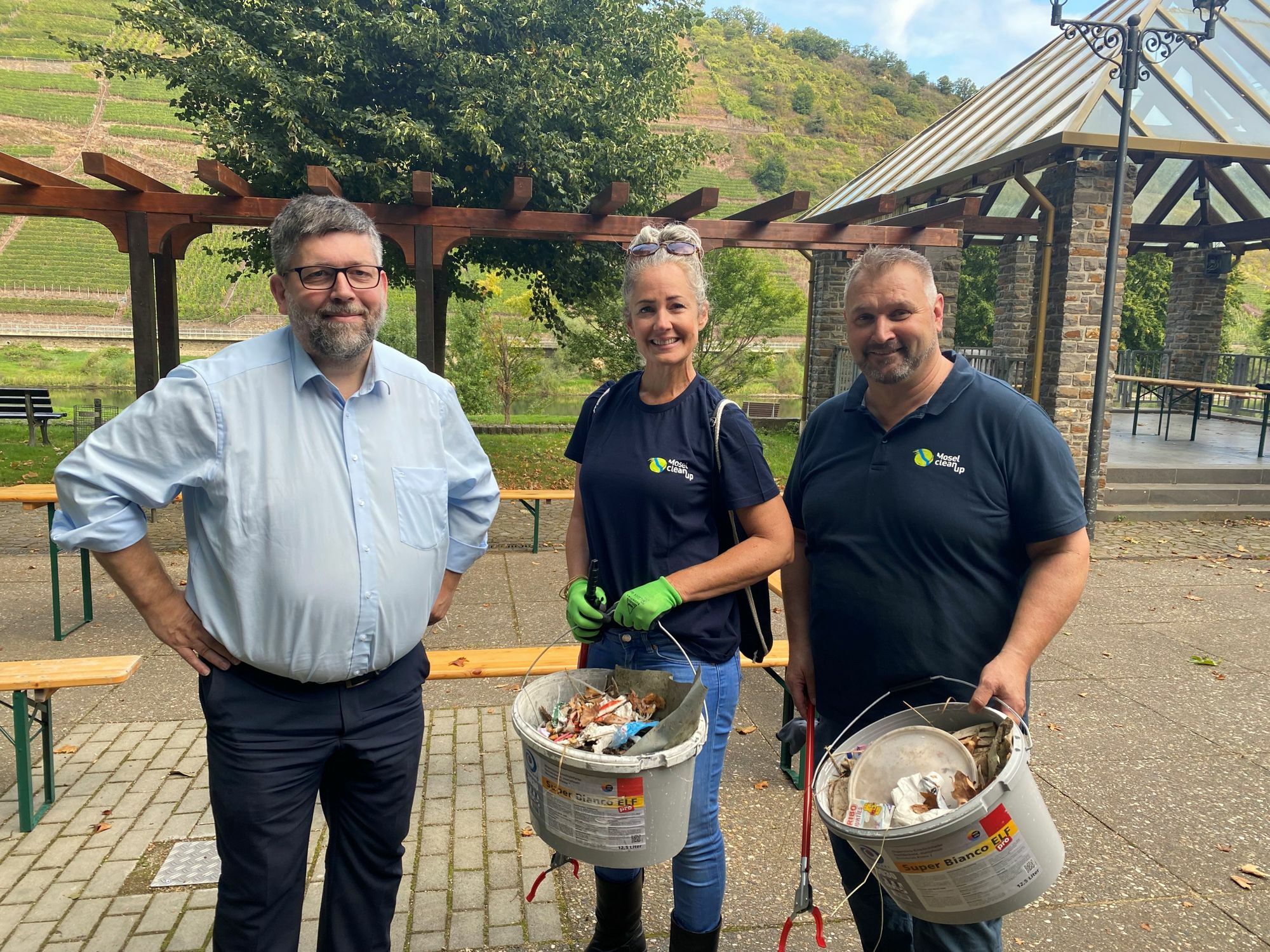 Wer am Samstag an der Mosel entlanggefahren ist, der konnte immer mal wieder Gruppen sehen, die Unrat und Müll sammelten. Ersten Schätzungen zur Folge waren rund 7.000 Männer, Frauen, Kinder und Jugendliche an den Ufern der Mosel beim "Mosel CleanUp" aktiv. Stefan Ernst, Flussbeauftragter von Bernkastel bis Koblenz, war in jedem Fall sehr zufrieden mit der Beteiligung. "Bei uns in Bruttig-Fankel hatten wir 77 Teilnehmerinnen und Teilnehmer – mehr als im vergangenen Jahr", gab Ernst zu Protokoll. Mit in Bruttig-Fankel dabei war auch die Schauspielerin Yve Burbach, bekannt durch die Serie "Soko Stuttgart". "Das hat natürlich alle motiviert", freute sich Stefan Ernst. Aber es brauchte eigentlich kaum externe Motivation. In Treis waren es die Ruderinnen und Ruderer der Rudergesellschaft, die ihr Revier reinigten. "Es war eigentlich relativ sauber. Nur rund um die Supermärkte war viel. Und Zigarettenkippen gab es jede Menge", so die RGler. "Wir hatten gefühlt die doppelte Menge an Müll. Insbesondere große Teile, wie Paletten und eine Matratze. Wahrscheinlich durch das Hochwasser im Juli bedingt", erzählt Stefan Ernst. Er durfte sich aber auch freuen, denn die Bereitstellung von Müllklammern, Handschuhen und sonstigem Material wurde allenthalben gelobt. "Was übriggeblieben ist, kann schon für das kommende Jahr zurückgelegt werden.«" Fotos: privat/Pauly www.moselcleanup.org