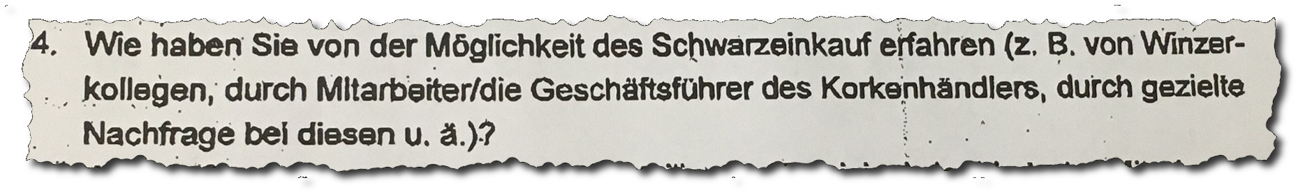In dem Schreiben, das an die Winzer ging (liegt dem WochenSpiegel vor), geht es um insgesamt neun Fragen. So will der Leiter der Steuerfahndung in dem Schreiben wissen, von wem die Winzer den Tipp etwa für das Rechnungssplitting bekommen haben. Zitat aus dem Schreiben: »Wie haben Sie von der Möglichkeit des Schwarzeinkauf erfahren (z.B. von Winzerkollegen, durch Mitarbeiter/die Geschäftsführer des Korkenhändlers, durch gezielte Nachfrage bei diesen u.ä.)?« Ein Steuerfahnder: »Einige Winzer haben auf die Schreiben bereits reagiert und Informationen weitergegeben. Sie fürchteten zu einer Vernehmung nach Trier geladen zu werden.« Das »drohte« der Leiter der Steuerfahndung den Winzern auch offen an: »Sofern mir Ihre Antwort bis zum (….) nicht zugegangen ist und Ihnen ein Zeugnis- oder Auskunftsverweigerungsrecht nicht zusteht, müssen Sie mit einer Ladung zu Ihrer Vernehmung rechnen.«