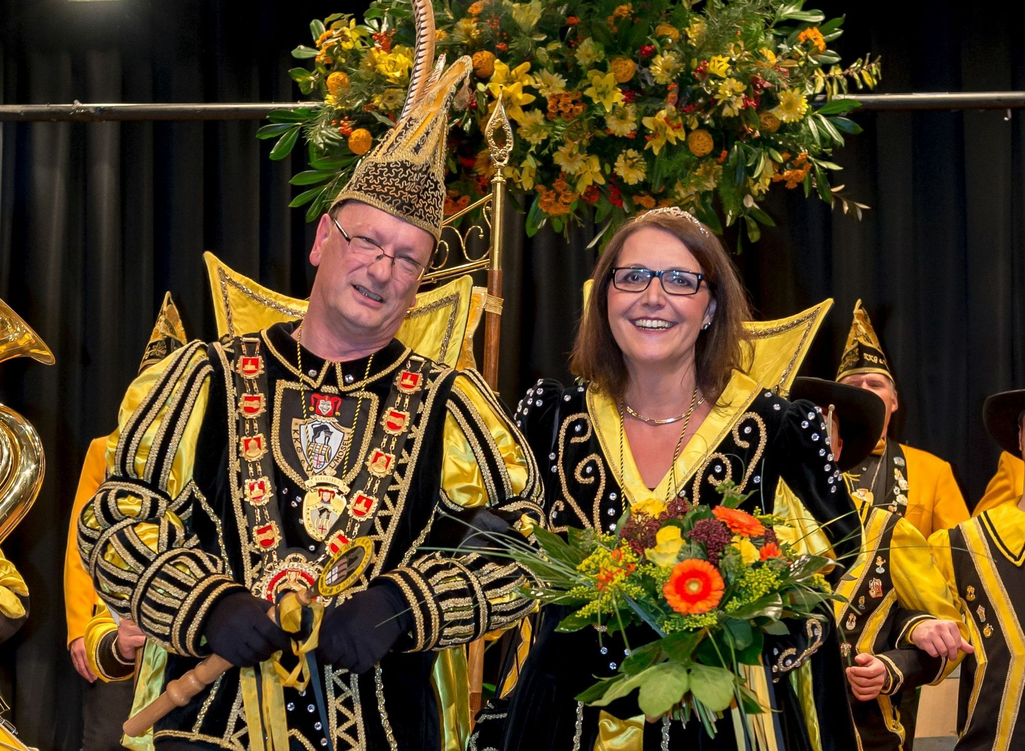 Nachdem die "Soome Lissja" ihr Abschiedslied für das "alte" Prinzenpaar zum Besten gaben, war es im Rahmen eines unterhaltsamen, karnevalistischem Abends Zeit, Abschied zu nehmen. Prinz Norbert I. (Norbert Reinisch) und Prinzessin Doris II. (Doris Laux) bedankten sich bei allen Karnevalisten und gaben den Start für die neue Session frei. Unter den Klängen der Klingenden Musketiere marschierte der Tross der schwarz-gelben Karnevalisten mit dem neuen Prinzenpaar durch die Zuschauermenge. Das Zeller Prinzenpaar wurde vorgestellt: Prinz Bernhard I. (Bernhard Stark) - als Hotzelhecker Jung, bringt er beruflich den Kunststoff in Schwung und Prinzessin Dorothee I. (Dorothee Friederich) - hat’n guten Draht zum lieben Gott und ist Dank Kreislaufpflege richtig flott. Foto: Philipp Bohn www.kkgzell.de