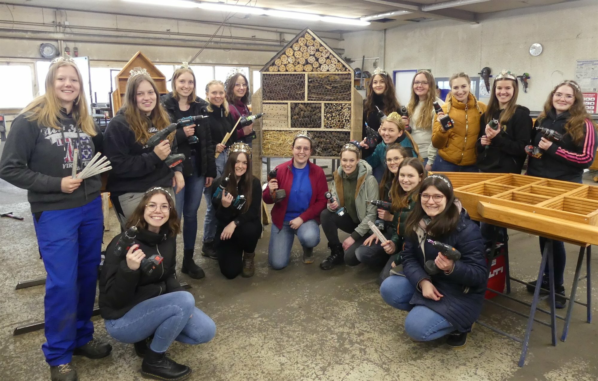 Cochem. 18 Weinmajestäten aus dem Ferienland Cochem haben zwölf Insektenhotels in Handarbeit hergestellt. Der Verkauf von Backbüchern und Gebäck auf dem Cochemer Weihnachstmarkt und Spenden legte die finanzielle Basis für die Herstellung der Insektenhotels. Jetzt tauschten die Weinmajestäten ihre Weingläser gegen Zollstock und Akkuschrauber, und sägten und schraubten einen ganz Tag lang bei Metallbau Loosen in Brauheck, um besagte Behausungen für die heimische Insektenwelt herzustellen. Bei der Materialbeschaffung griffen sowohl Cochems Forstamtsleiter Markus Nockelmann, der Baumarkt Hieronimi sowie der Dachdeckerbetrieb Marx mit Holz, Öl Lasur, Maschendraht und Schiefer hilfreich unter die Arme. Die für die Natur hilfreichen Kästen werden zeitnah in den Grüngürteln jener Ortschaften im Ferienland Cochem installiert, aus denen die an der Aktion beteiligten Weinregentinnen kommen. So können sich jetzt Müden, Pommern, Klotten, Cochem, Ernst, Valwig, Bruttig-Fankel, Senheim, Mesenich, Ellenz-Poltersdorf, Ediger-Eller und Bremm über die Insektenhotels aus majestätischen Händen freuen.