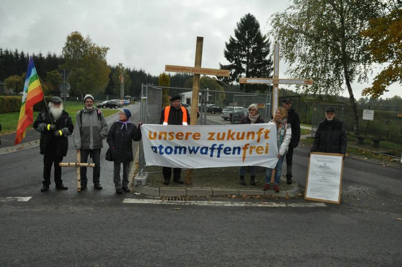 Unsere Zukunft soll atomwaffenfrei sein, fordern die Friedensaktivisten um Matthias Engelke. Der evangelische Pfarrer trägt die Losung der Mahnwache auf dem Kreuz: "Atomwaffen abschaffen - jetzt!" Start der Demonstration für den Frieden war am Mittwochmittag - pünktlich um 11.57 Uhr. "Die Gefahr eines Atomkrieges ist gestiegen. Es ist drei vor zwölf", formuliert Engelke seine Einschätzung, die vor dem Hintergrund der Konflikte in der Ukraine und in Syrien die Welt an den "Rand einer Katastrophe" gebracht hätten. "Atomwaffen gehören weg. Sie sind ein Verbrechen gegen die Menschheit", sagt Engelke, der eine Idee von Pfarrer Rainer Schmid aufgegriffen hat, der im August mit dem Kreuz vor dem Fliegerhorst demonstrierte. Dass in Büchel Atomwaffen lagern ist für die Aktivisten klar, ohne dass es bisher bestätigt wurde. "Dass wir hier sind ist unser gutes Recht auf freie Meinungsäußerung. Ich weiß, dass viele Soldaten auch so denken wie wir", erklärt der Pfarrer, der bis Donnerstagmittag, 11.57 Uhr, das "Kreuz" zeigen will. Die Zahl der Mitstreiter - und sei sie auch noch so gering - freut ihn: "Alles fängt klein an." Foto: Pauly