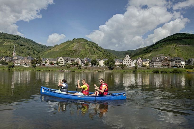Bei einer Kanu-Tour auf der Mosel kann man den Fluss und die einzigartige Landschaft hautnah erleben. Die Mosel zeigt sich dabei als idealer Paddelfluss durch Weinberge hindurch, an Winzerdörfern, Naturschutzgebieten und Burgen vorbei. Hinter jeder Flussbiegung bietet sich den Kanuten ein neuer fantastischer Blick aus einer einzigartigen Perspektive heraus. Neben Kanus haben Besucher auch die Möglichkeit, SUP-Boards und Fahrräder zu mieten. Und für alle, die keine "Paddelprofis" sind: Keine Sorge! Auch Kanu-Anfänger können auf der Mosel fahren. Die Meisten, die sich zum ersten Mal in ein Kanu oder Kajak setzen, haben nach wenigen Paddelschlägen verstanden, wie ein Boot zu steuern ist. So steht dem Spaß nichts im Weg. Zudem fließt die Mosel in gemächlichem Tempo, sodass starke Strömungen und Strudel nicht zu erwarten sind. Kanutouren auf der Mosel sind daher auch ein Spaß für die ganze Familie. Für die kleinsten Kanuten gibt es Rettungswesten in passenden Größen. Außerdem können die Zweier-Kajaks zusätzlich mit einem Kindersitz - für Kinder bis sechs Jahre - ausgerüstet werden. Auf alle angebotenen Touren erhalten Familien zudem einen Rabatt. Und noch ein besonderer Tipp: Ab der Kanustation Ernst werden Abendrundfahrten im Großkanadier mit Steuermann angeboten. Dieser außergewöhnliche Kurztripp mit unvergleichlicher Atmosphäre findet am frühen Abend statt und kann ab acht Personen gebucht werden. Kanu-Stationen gibt es in Ernst, Pünderich und Ediger-Eller. Alle wichtigen Informationen rund um den Kanu-Ausflug gibt es unter: www.mosel-kanutours.de Foto: Mosel-Kanutours