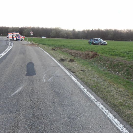 Nach einer ersten Einschätzung der Polizei geriet der Pkw auf den unbefestigten Seitenstreifen und überschlug sich anschließend in angrenzenden Feld. Der 24-jährige Fahrer des Pickup wurde dabei leicht verletzt. Foto: Polizei