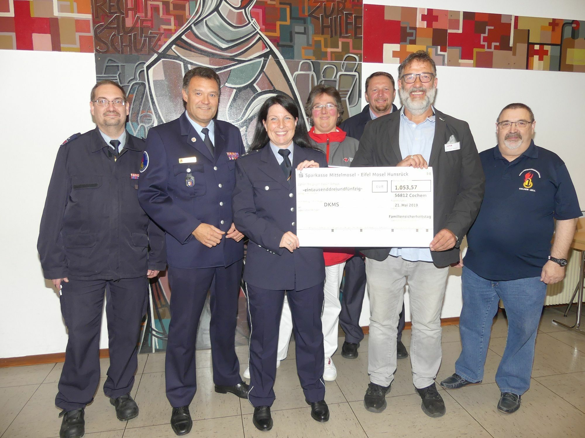 1053,57 Euro wies der Spendenscheck aus. Das Geld ist beim Familiensicherheitstag 2018 als Erlös zusammengekommen. Hier hatten die Vertreter der "Blaulichtfraktionen" auf dem Cochemer Endertplatz einen Tag lang Sicherheit anhand von Theorie und Praxis für die ganze Familie vermittelt und in diesem Zusammenhang unter anderem auch für das leibliche Wohl der Besucher gesorgt. DKMS-Knochenmarkspender Michael Franzen aus Kennfus nahm den Scheck im Rahmen einer kleinen Feierstunde im Auftrag der Hilfsorganisation entgegen.  Foto: privat www.dkms.de